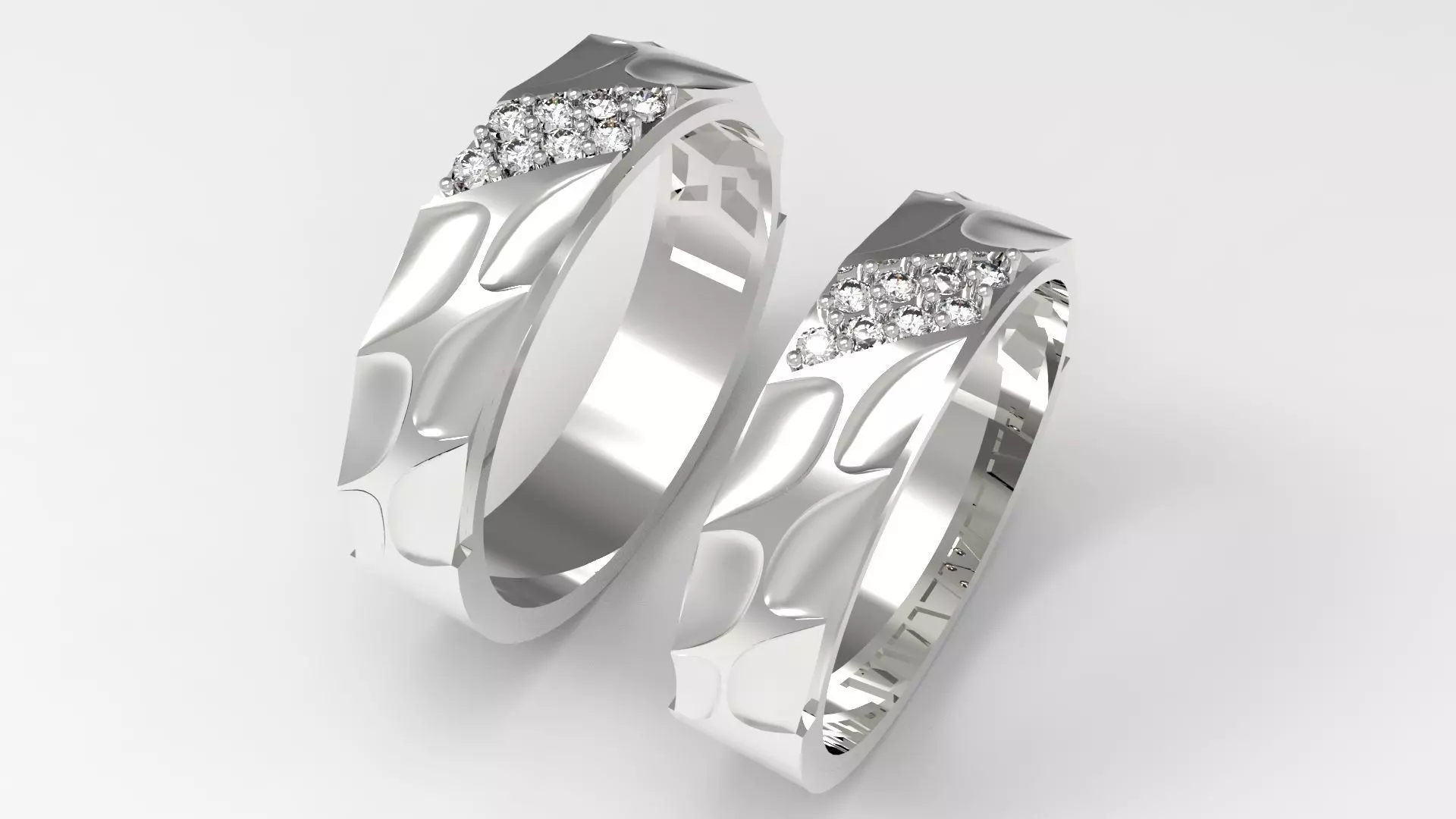 These are a pair of matching rings, likely wedding or engagement bands, crafted from a shiny metal—probably silver or white gold. The rings feature an elegant, modern design with a textured, petal-like pattern engraved on the outside. Each ring is adorned with a row of small, sparkling gemstones, possibly diamonds, which are set along a part of the top surface, adding a touch of luxury and brilliance to the design. The overall look is contemporary, sophisticated, and stylish.