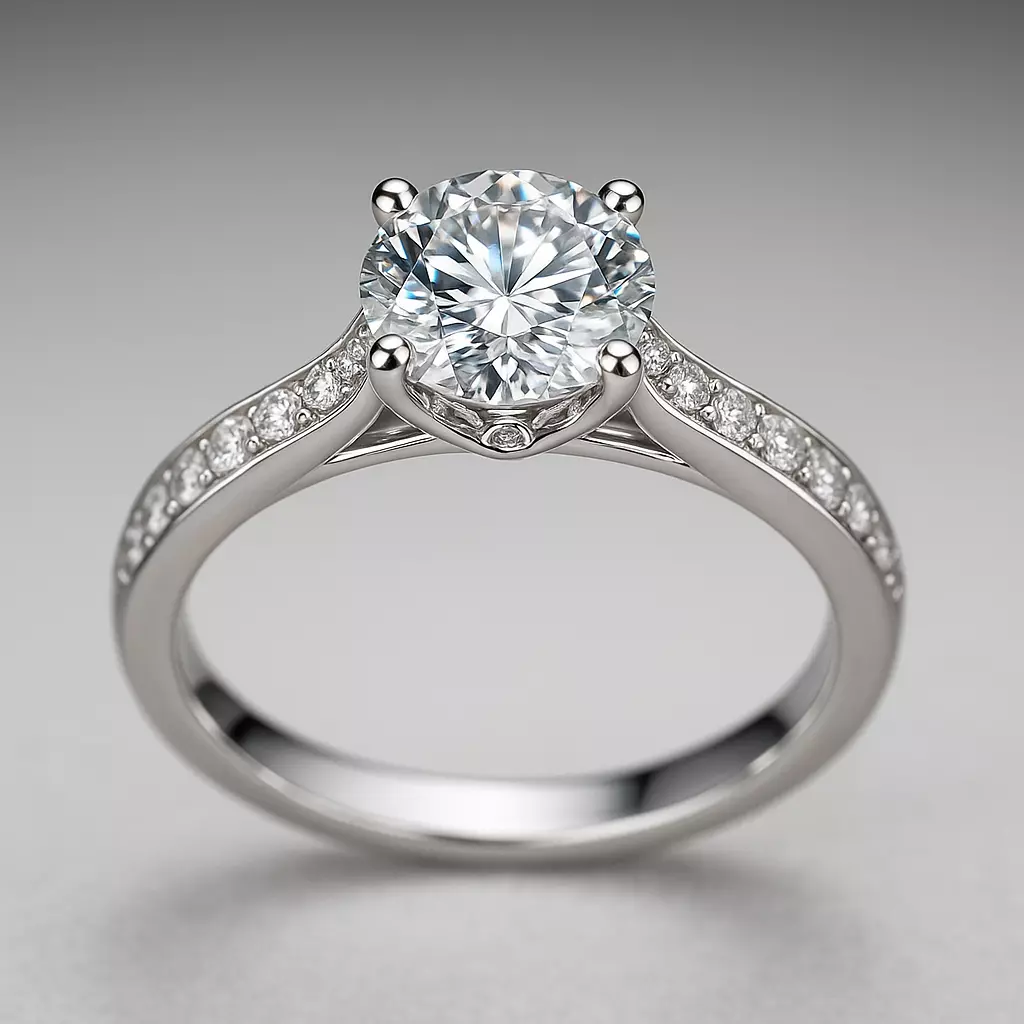 This is a highly detailed 3D model of a white gold solitaire engagement ring, featuring a brilliant-cut center diamond flanked by smaller pavé-set diamonds along the band. The elegant curvature, prong setting, and polished finish make it perfect for bridal jewelry visualizations, product showcases, or digital jewelry catalogs.