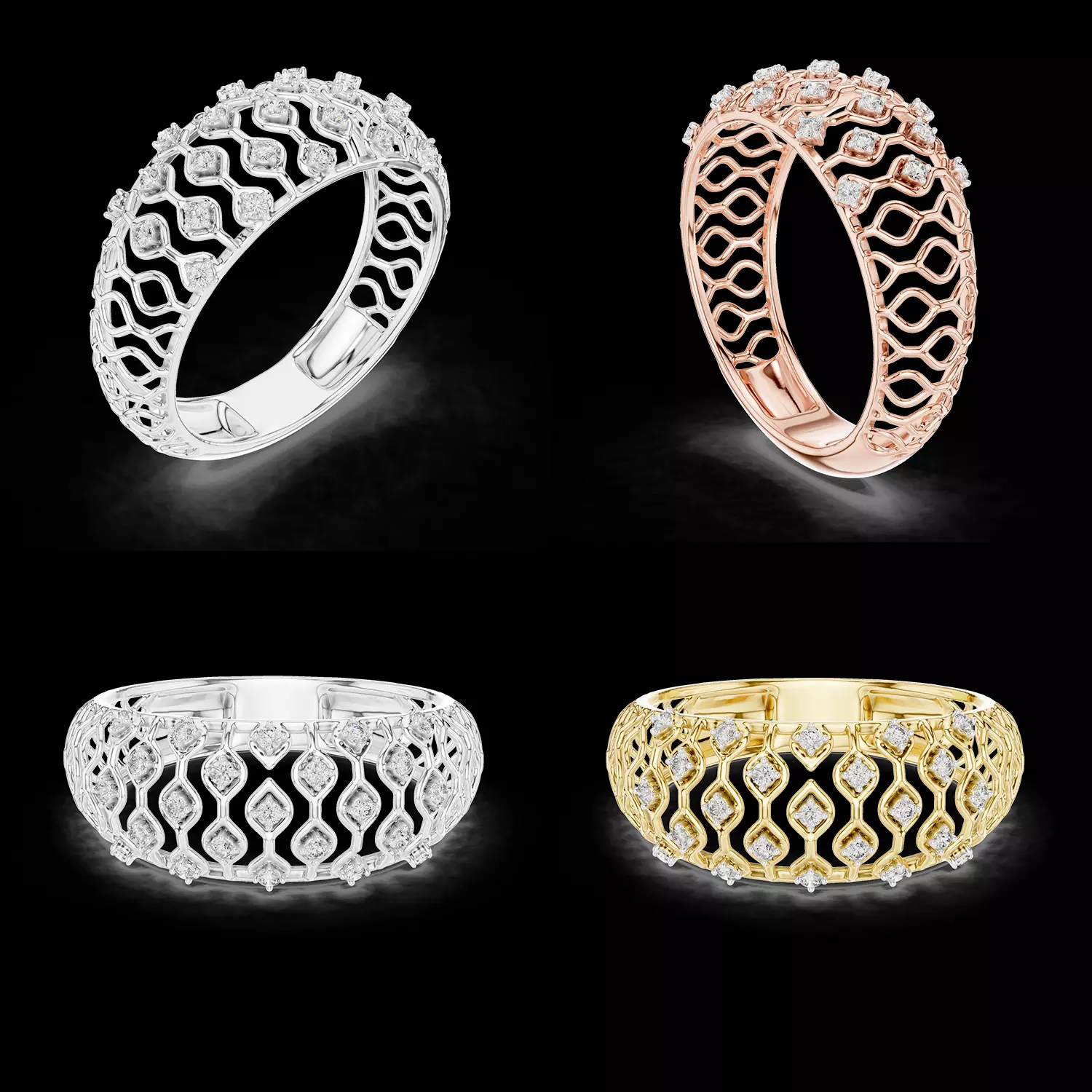 Important PointsWide band with strong visual presenceIntricate lattice (jaali) openwork designMultiple diamond settings for enhanced sparkleLightweight structure despite bold lookComfortable inner band finishProduction-ready CAD modelClean and precise stone placementSuitable for all precious metals