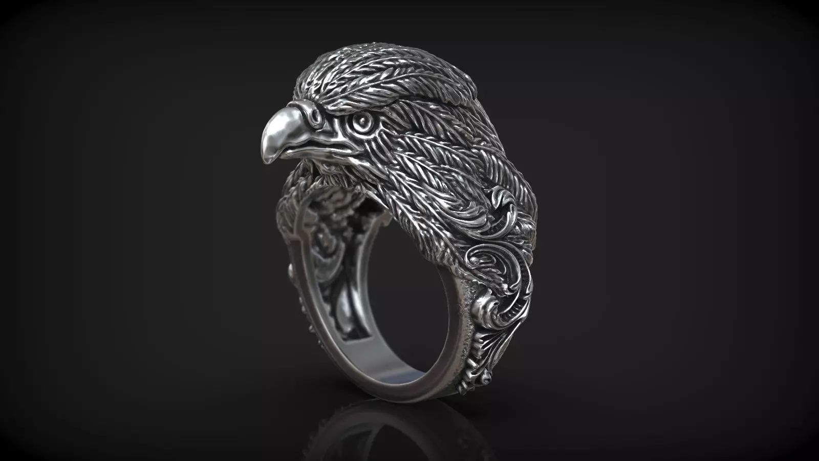 The 3D model of the jewelry ring showcases a captivating design featuring an intricately crafted Eagle head and pattern in the Rococo style.At the centerpiece of the ring, an exquisitely detailed eagle head emerges, symbolizing power, majesty, and freedom. The eagle's fierce gaze and finely sculpted features bring a sense of lifelike presence to the ring.Surrounding the eagle head, the ring is adorned with a Rococo-inspired pattern that exudes elegance and extravagance. The pattern features delicate and flowing motifs such as swirling scrolls, floral elements, and intricate lace-like designs. These ornate details are meticulously carved into the ring's surface, creating a sense of dynamic movement and exquisite craftsmanship.The Rococo style, known for its lavishness and decorative flair, is beautifully incorporated into the ring's design. The combination of the regal eagle head and the Rococo pattern results in a visually stunning piece of jewelry that embodies both power and grace.