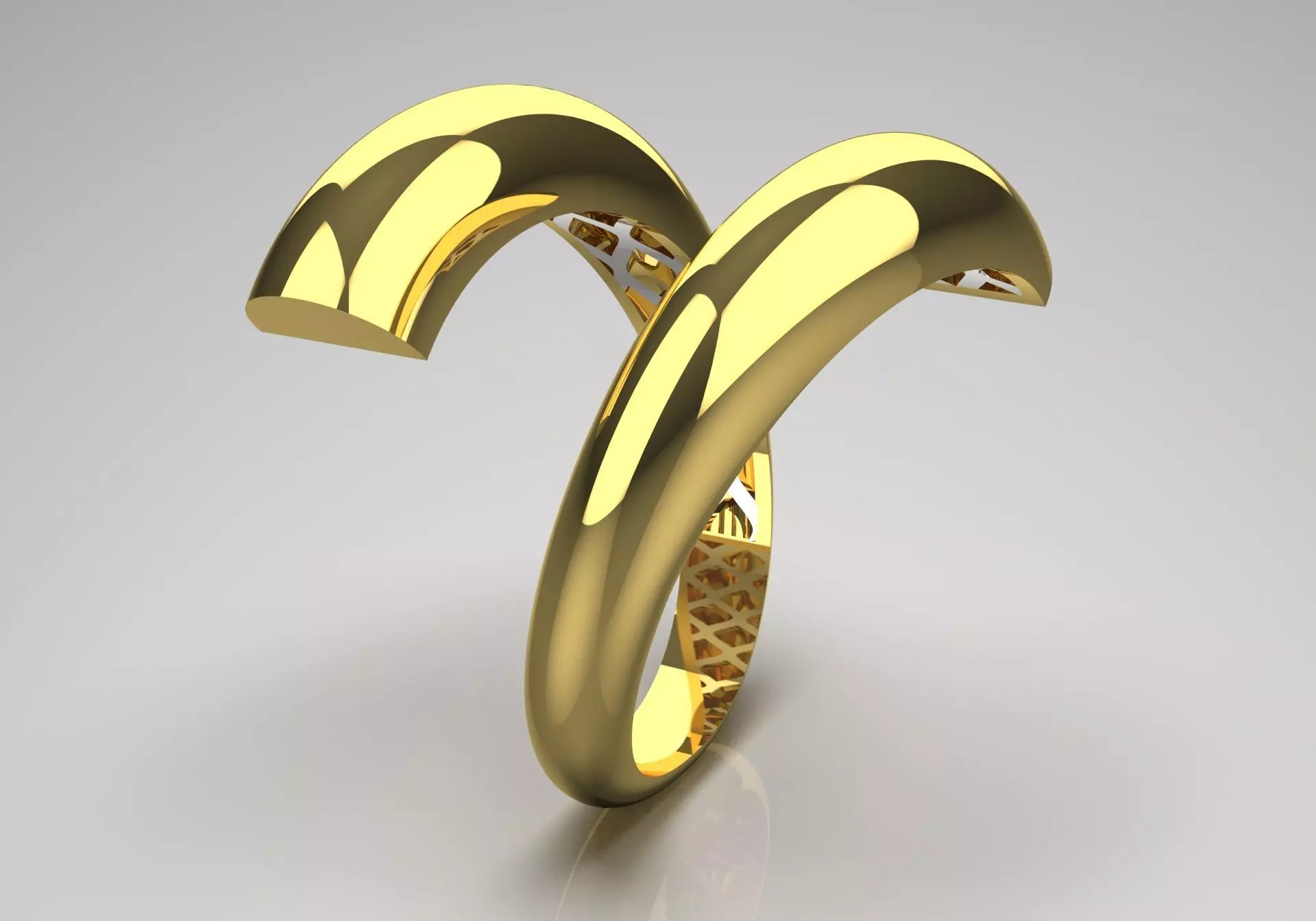The arm itself is sleek and smooth, encircling the finger with a comfortable fit, while the open space between the arcs enhances the airy feel of the ring. The shimmering yellow gold finish reflects light beautifully, giving the piece a radiant and luxurious look.