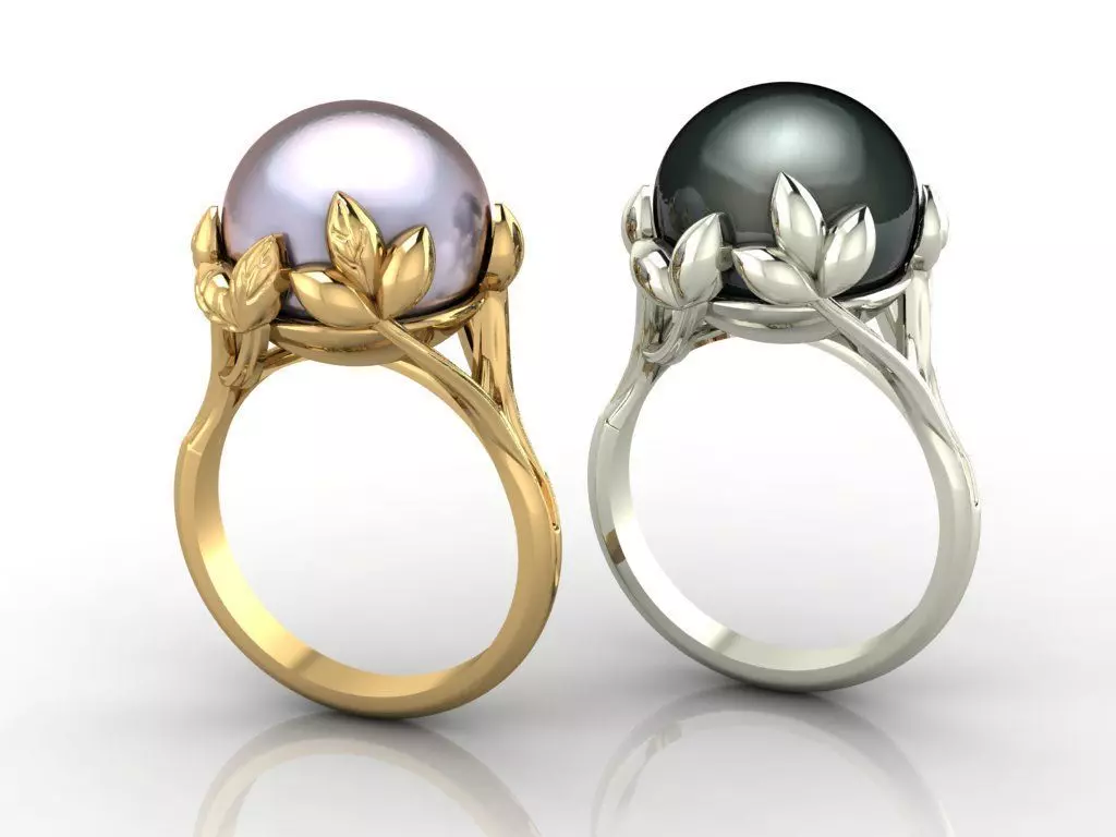 This women's ring features a single pearl set on the top, surrounded by small leaf-shaped details that wrap around the pearl. The ring band extends outwards in a branch-like design towards the pearl. This unique and elegant design is perfect for those looking for a delicate and nature-inspired piece of jewelry..pendant dimensions: X =18.72 y =15 z=28mm