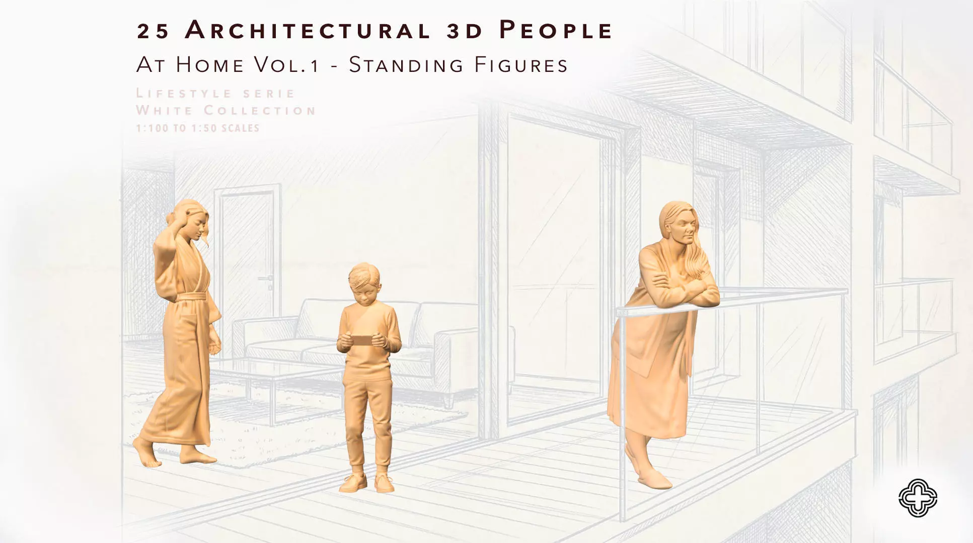 At Home Vol.1 - Standing Figures is a set of 25 architectural figures designed for interior home scenes in architectural models and archviz. These characters stand in quiet, everyday poses: leaning on walls, resting on balcony railings, looking out, waiting or simply inhabiting the space, bringing subtle life and human scale to apartments and houses. Many figures wear comfortable home clothing (loungewear, robes, socks) to underline the intimate, everyday at home atmosphere rather than a formal dress code.