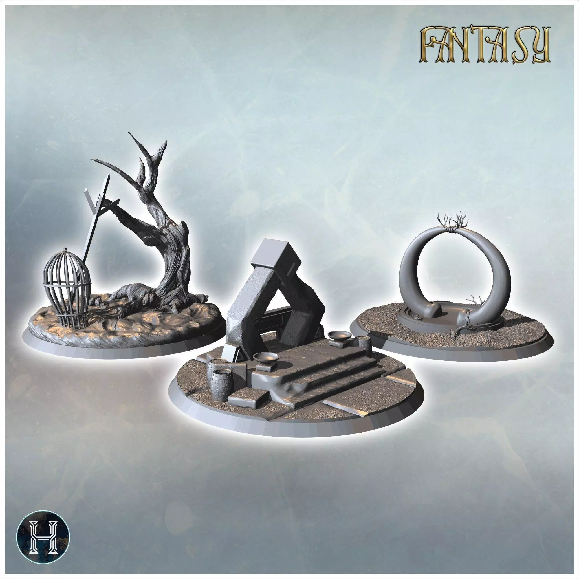 Circular structures featuring an archway a hut and a twisted tre 3D print model