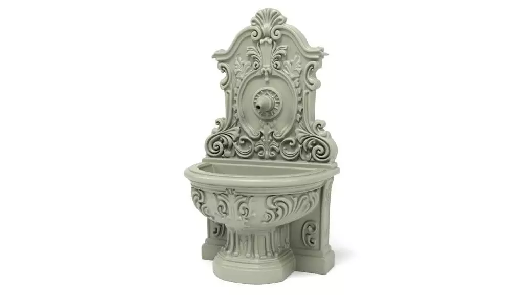 This classic wall fountain features intricate and ornate details, reflecting a sophisticated and timeless style suitable for traditional decor settings.