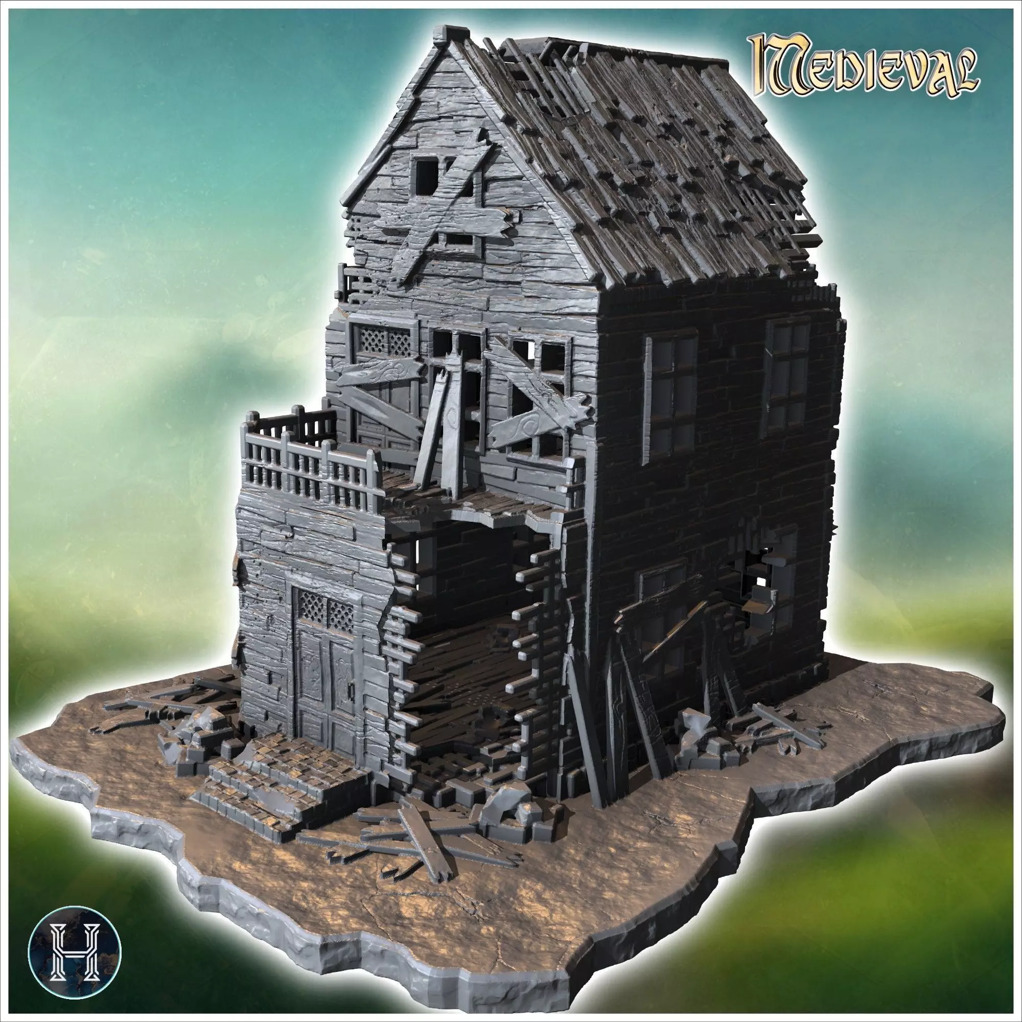 Collapsed two-story wooden structure with broken balcony damaged 3D print model