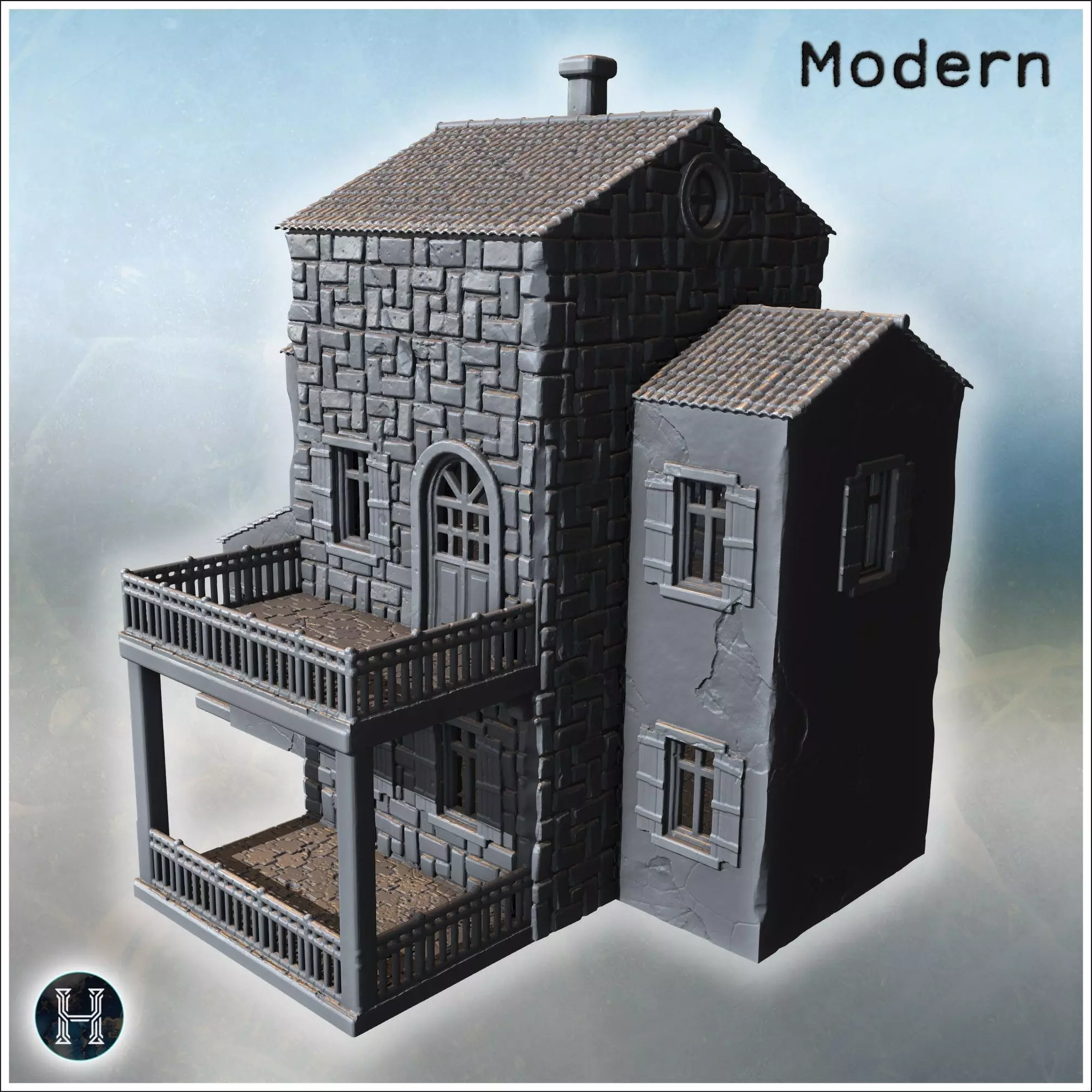 Compact building with patterned stone wall twin balconies and ro 3D print model