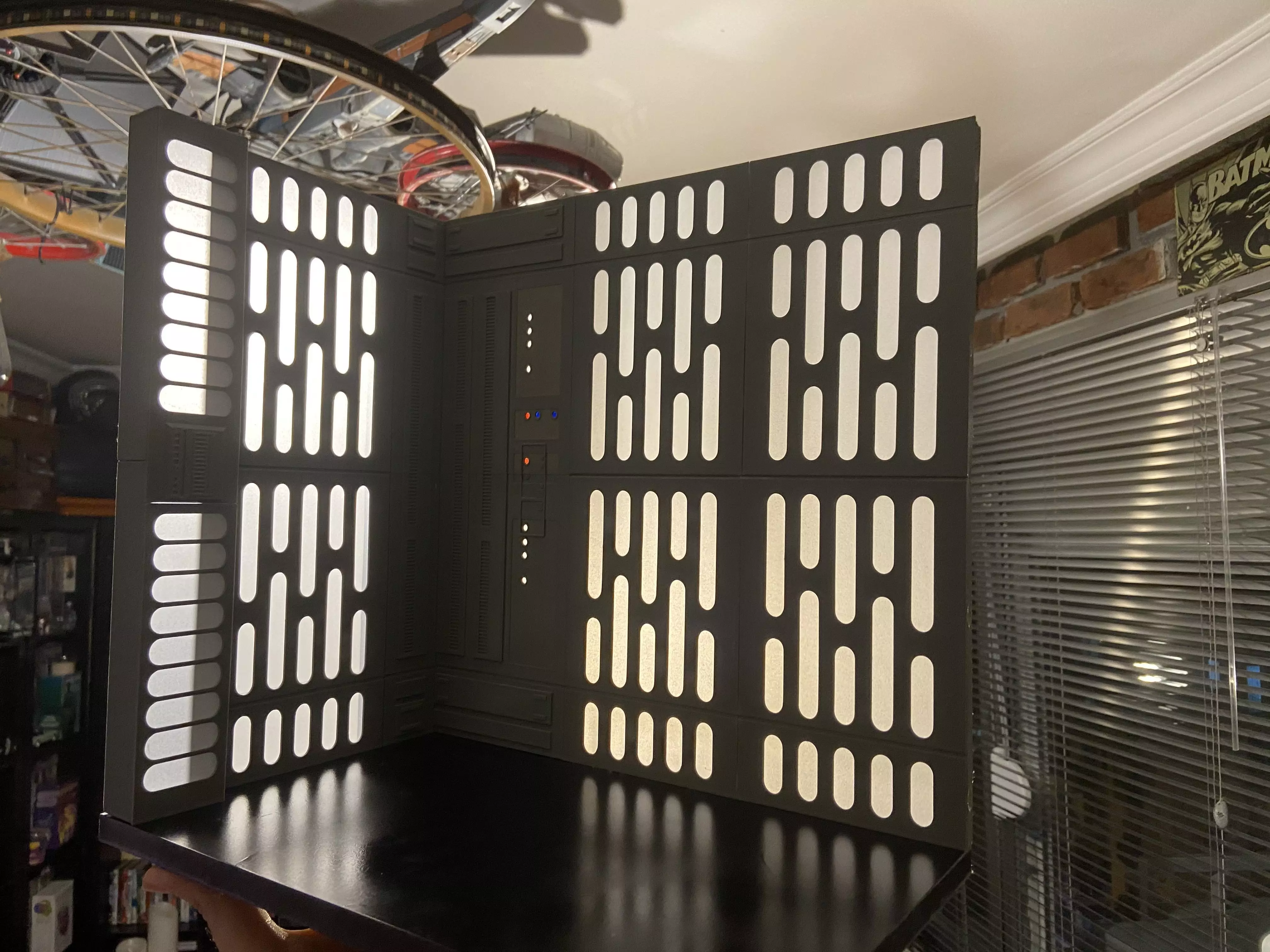 1/12 Scale Death Star diorama V2 (Updated with new parts, including new walls, pipes, inner door and columns) from Star Wars for the 6" figures like Hasbro Black Series and S H Figuarts. The model captures the iconic look of a death star's interior.