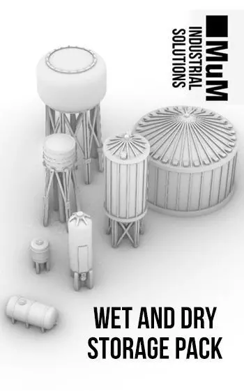 Dry and wet storage pack for tabletop miniature sceneries, dioramas and low poly gaming, design, animation. Includes 7 types of units, water towers, private depots, pressure tanks, tall and wide silos. Ideal for industrial modern, interwar and scifi settings over plastic, paper and cardboard sceneries.