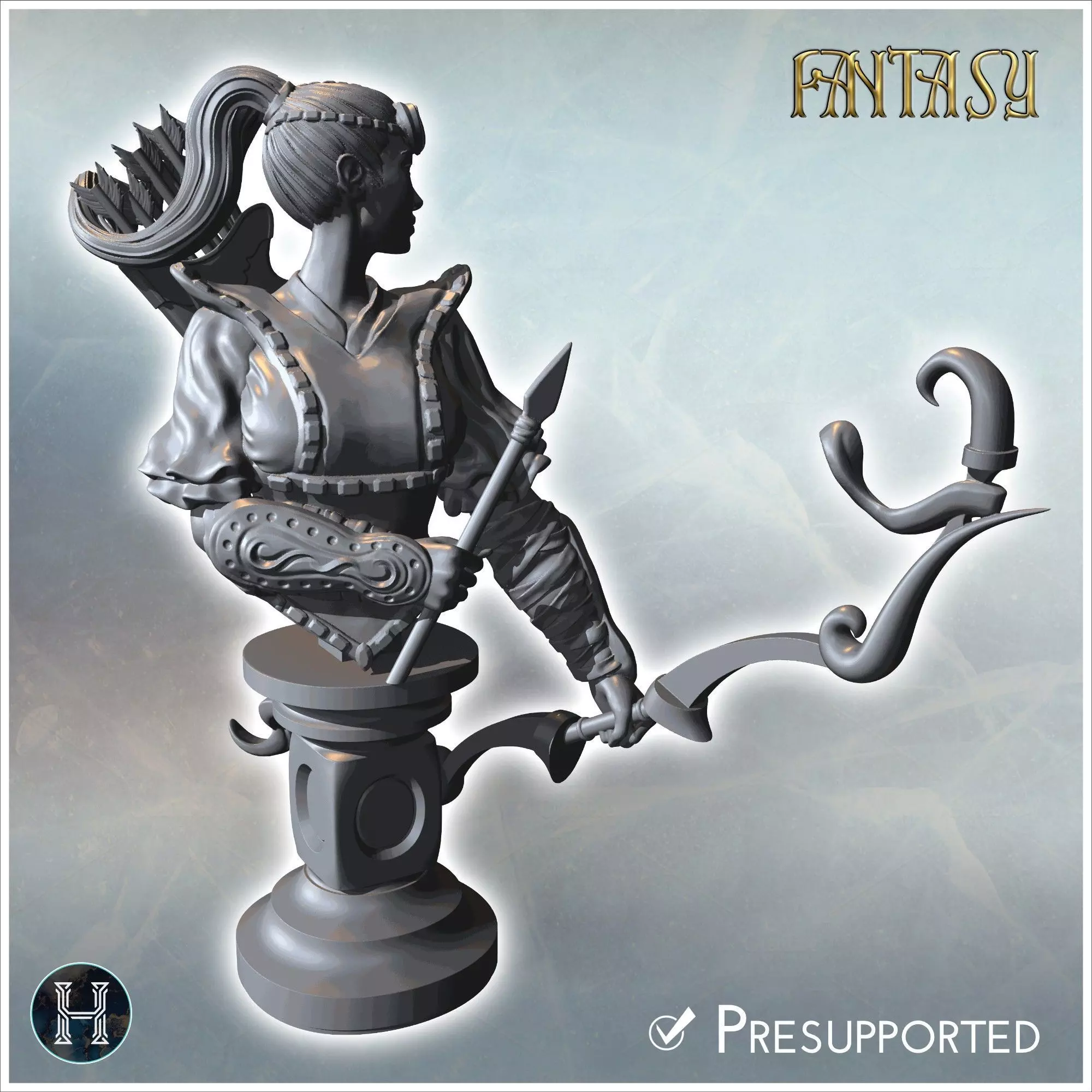 Female bust of an archer in armor detailed bracers holding a bow 3D print model