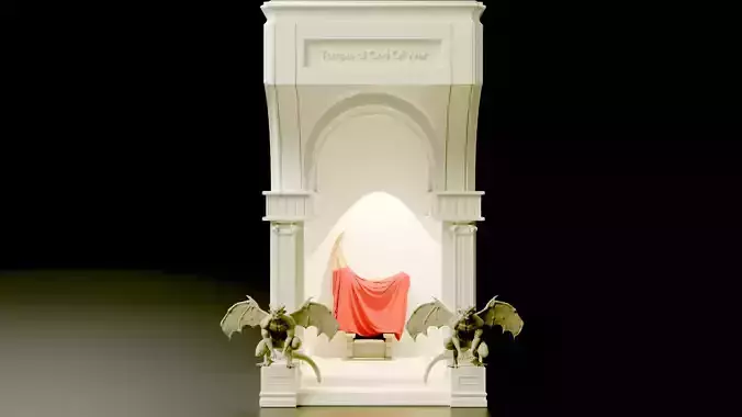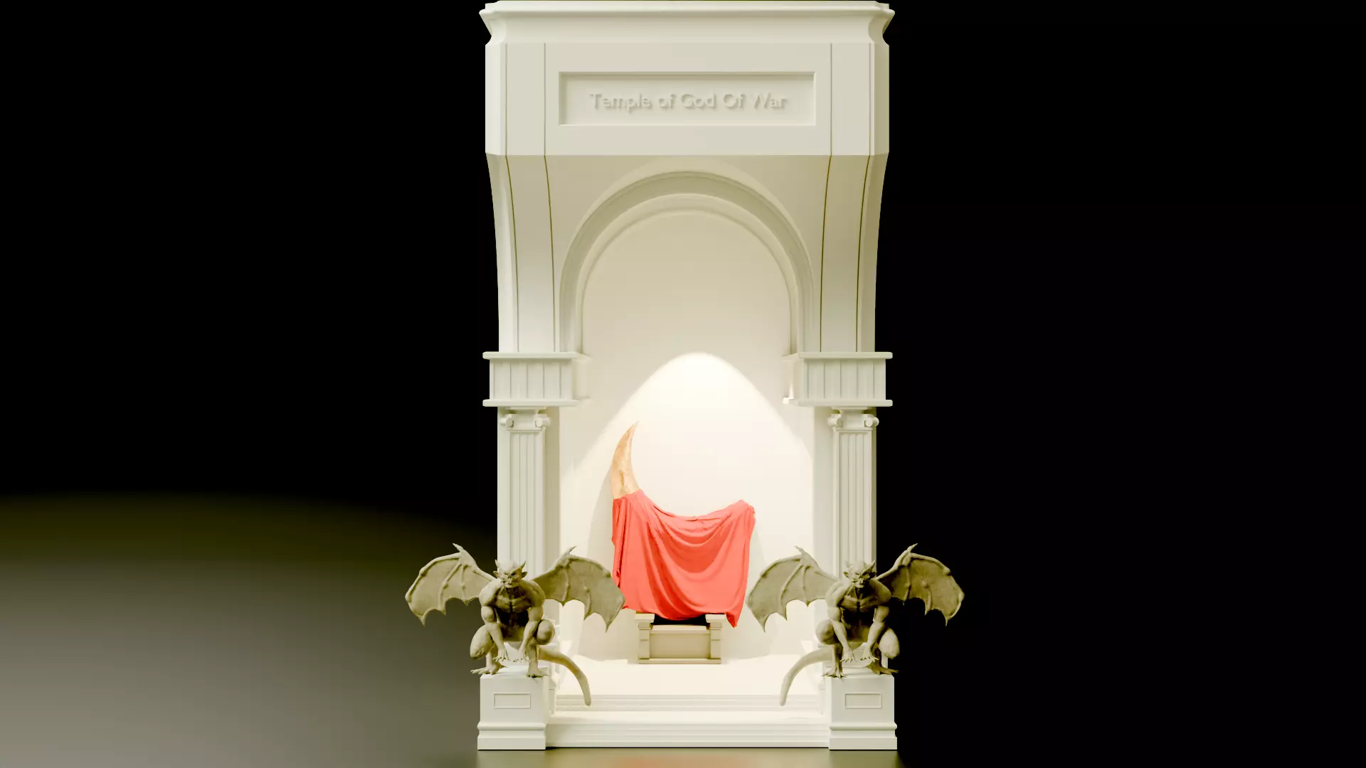 At the heart of the shrine, a throne placed within the inner chamber symbolizes the seat of the war god, subtly illuminated to create a powerful focal point. The recessed design allows light to flow outward in a soft, controlled glow, emphasizing the depth of the arch and the sculptural detailing. The symmetrical guardian figures at the base reinforce the theme of protection, dominance, and mythological grandeur.