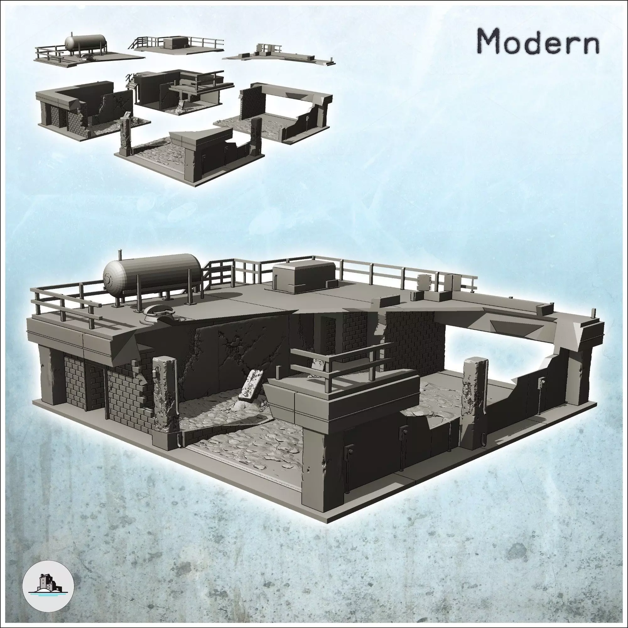 Industrial garage with rooftop annex and long antenna destroyed 3D print model