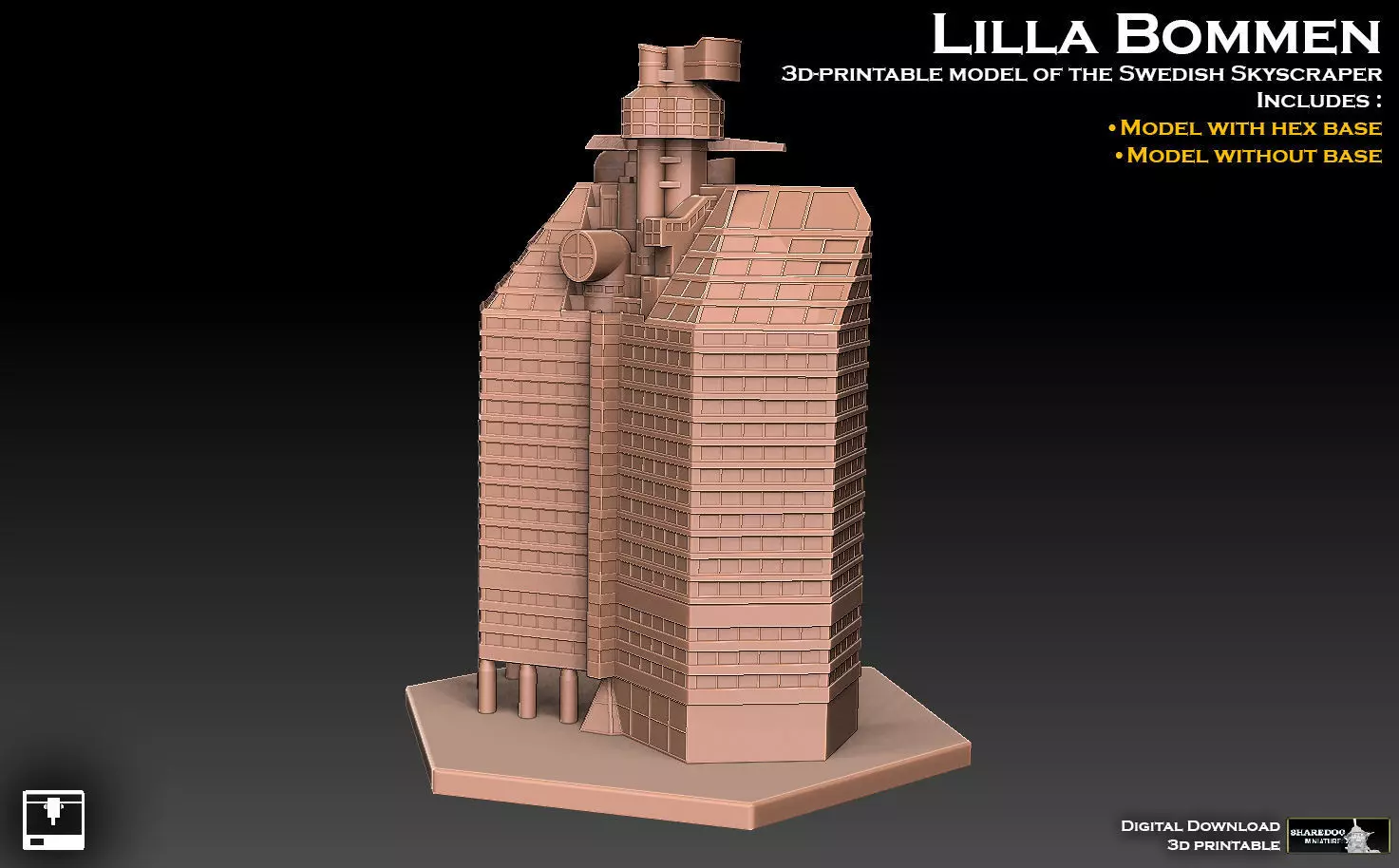 This model pack includes two versions of the Swedish skyscraper Lilla Bommen, completed in 1989. There is a model of the skyscraper with a hexagonal base, and one model without base. Suggested use is as scenery in tabletop games, or just as a decoration to put in your bookcase, on your work desk et cetera.