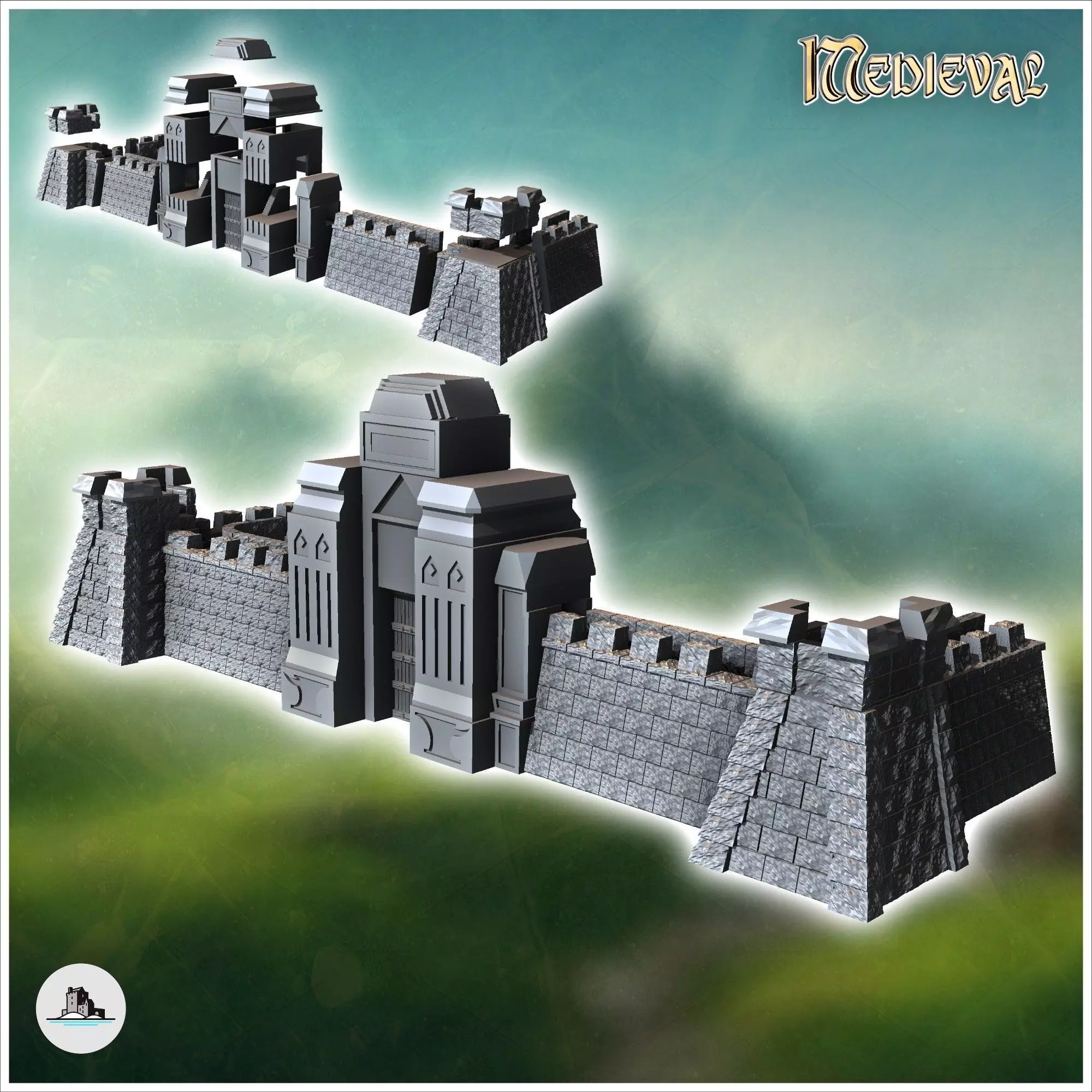 Medieval modular stone wall with large monumental carved door 14 3D print model