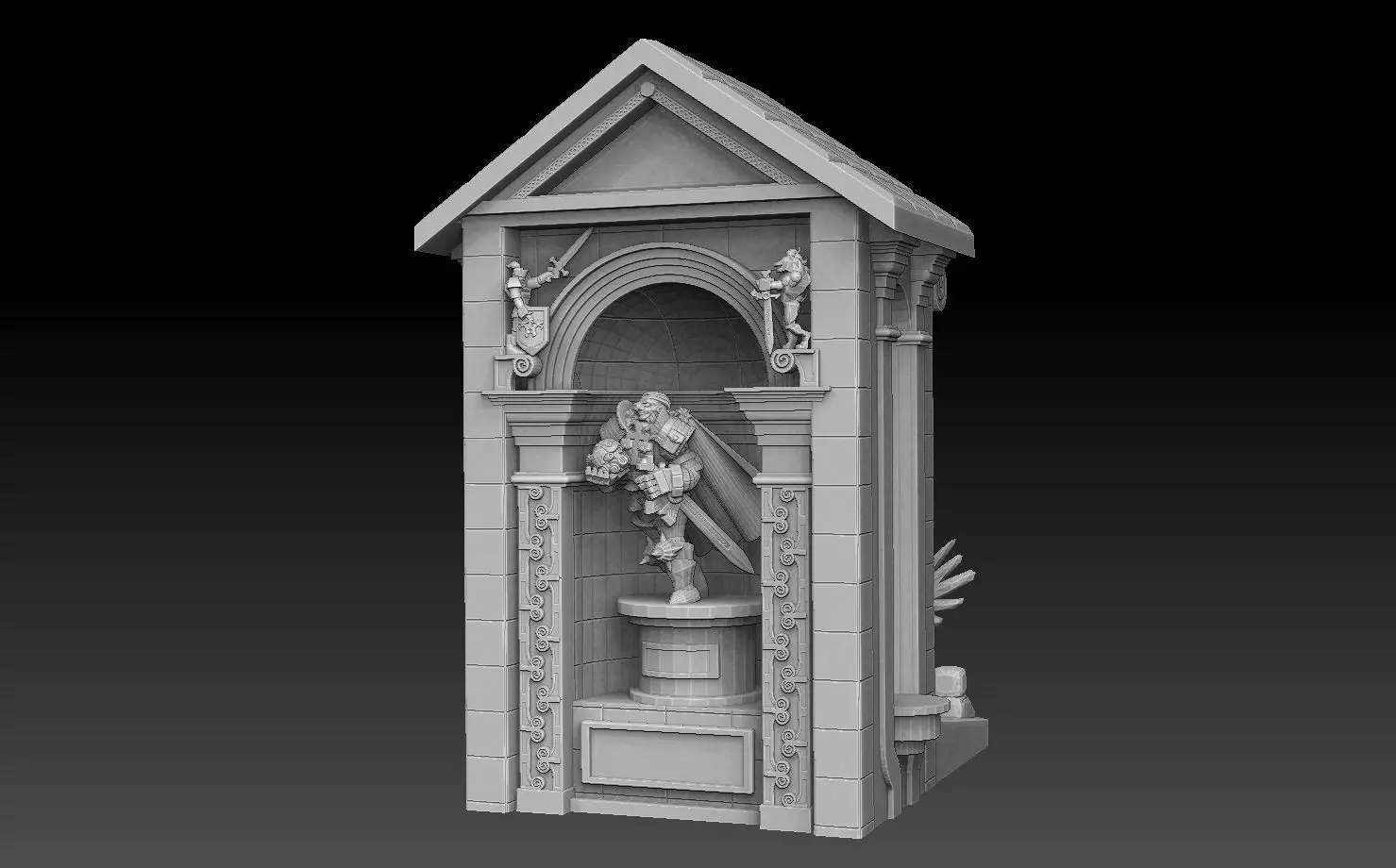 • Main Body. This model part includes the niche itself, the smaller side niches, the back wall where you can add a stat scroll, and the sloping back platform where you can add stat stones.