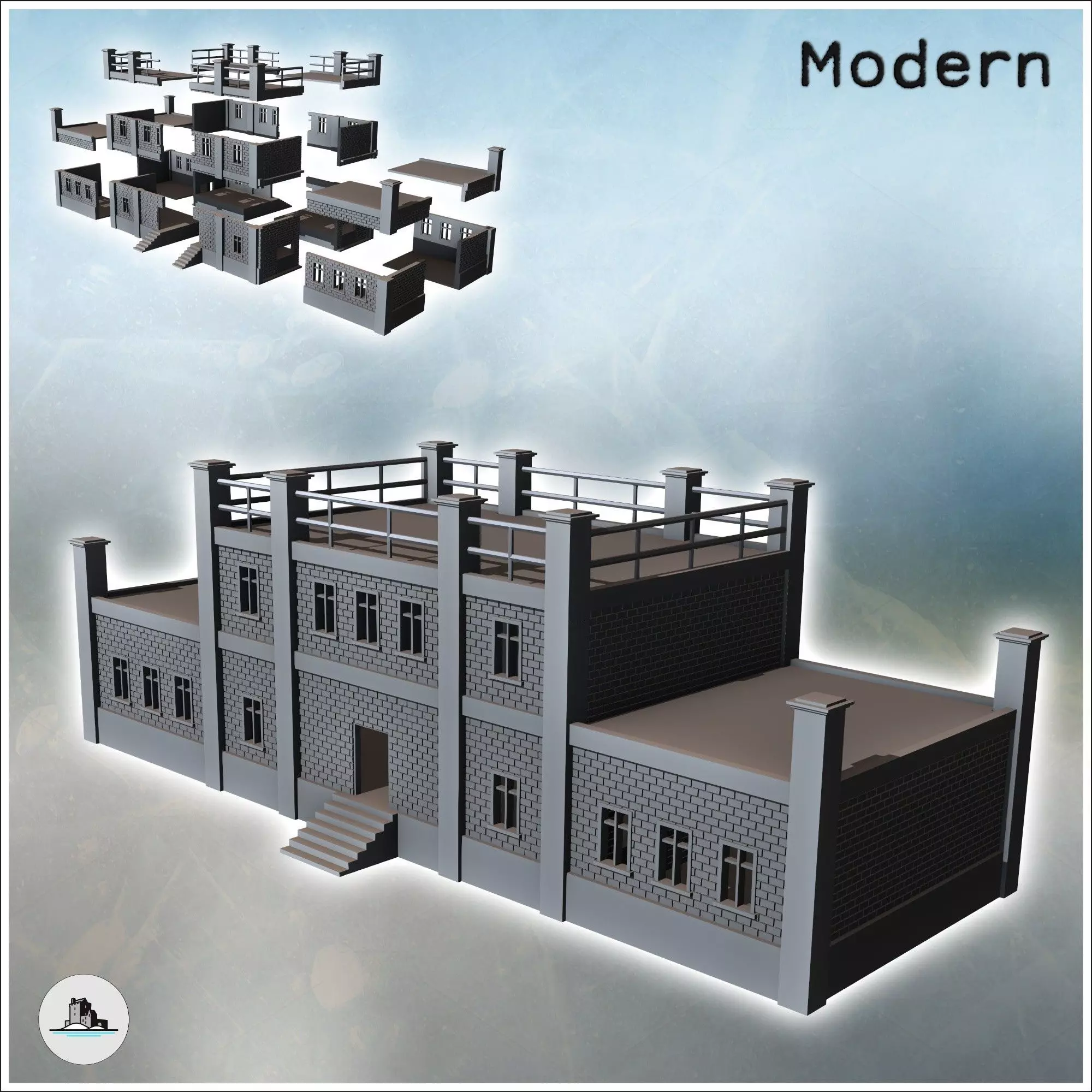 Modern brick building with flat roof access stairs and balustrad 3D print model