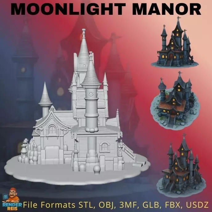 For custom designs, feel free to contact me.This enchanting model, the Moonlight Manor, adds a touch of fantasy and mystery to your 3D printing projects. With its tall spires, round windows, and rocky base, this mansion is perfect for night scenes or dioramas. The warm light effect shining through the windows makes it ideal for post-print lighting integration.The detailed surface texture and complex architecture showcase your printer’s resolution and precision. The hollow window design allows LED lighting to be added for a realistic glow. With painting and weathering techniques, the manor transforms into a personalized work of art telling its own story.