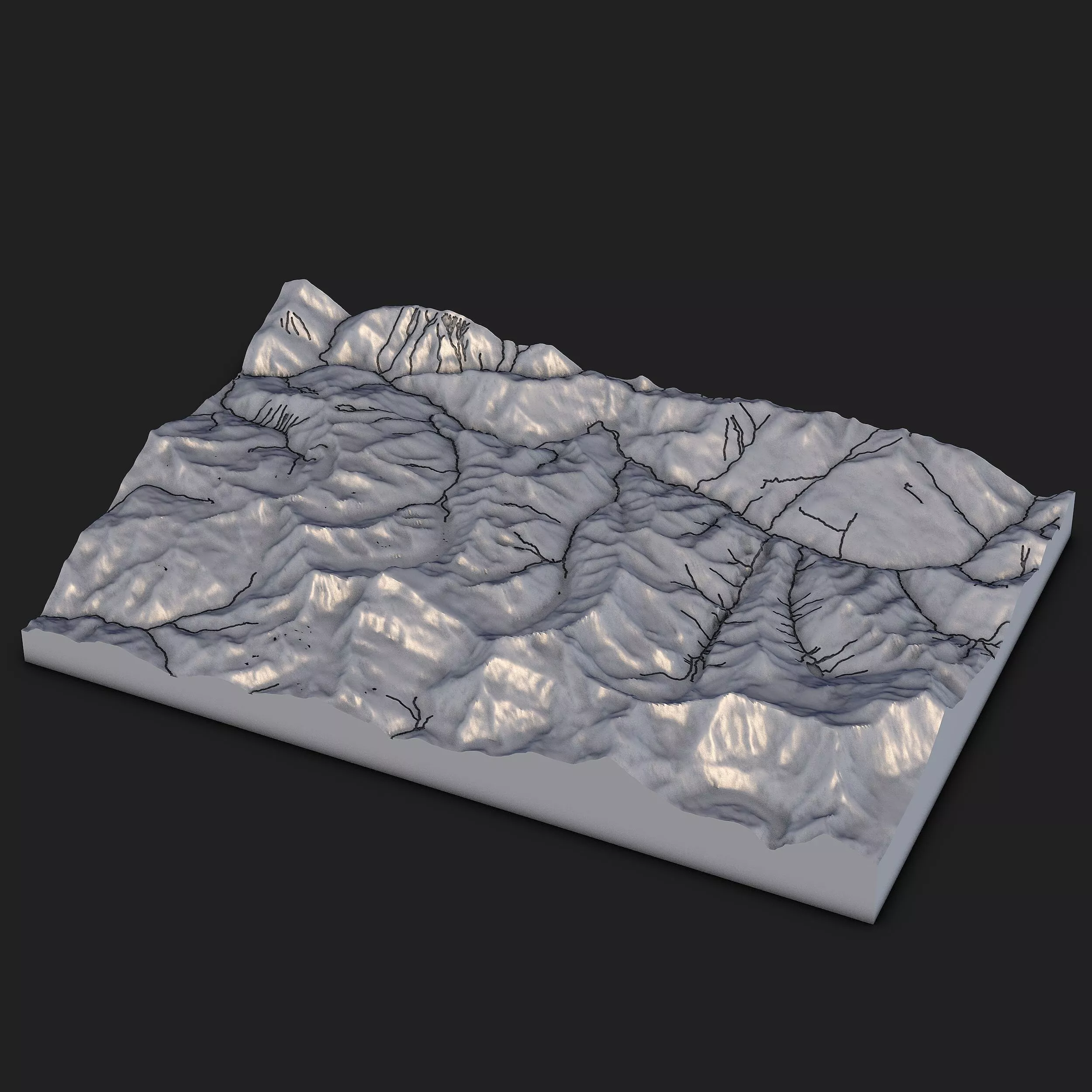 This 3D printable terrain block features a prominent mountain ridge, realistic slopes, erosion paths, and natural valley lines that create an authentic geographic relief effect.