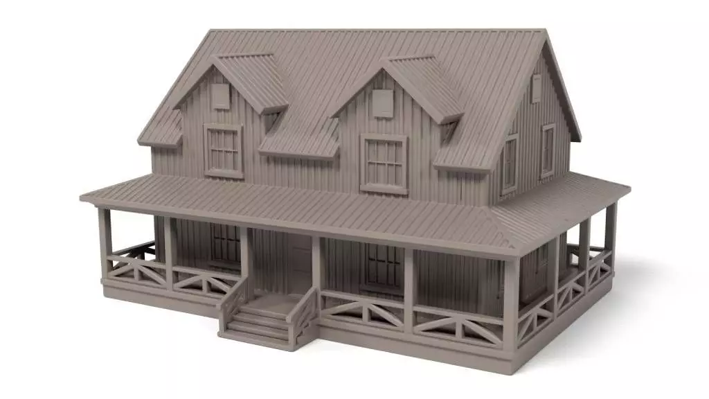 The North American house model features a classic architectural design with intricate details reminiscent of traditional American homes. The model includes features such as a wraparound porch, multiple dormer windows, and detailed wood paneling to capture the essence of North American domestic architecture.