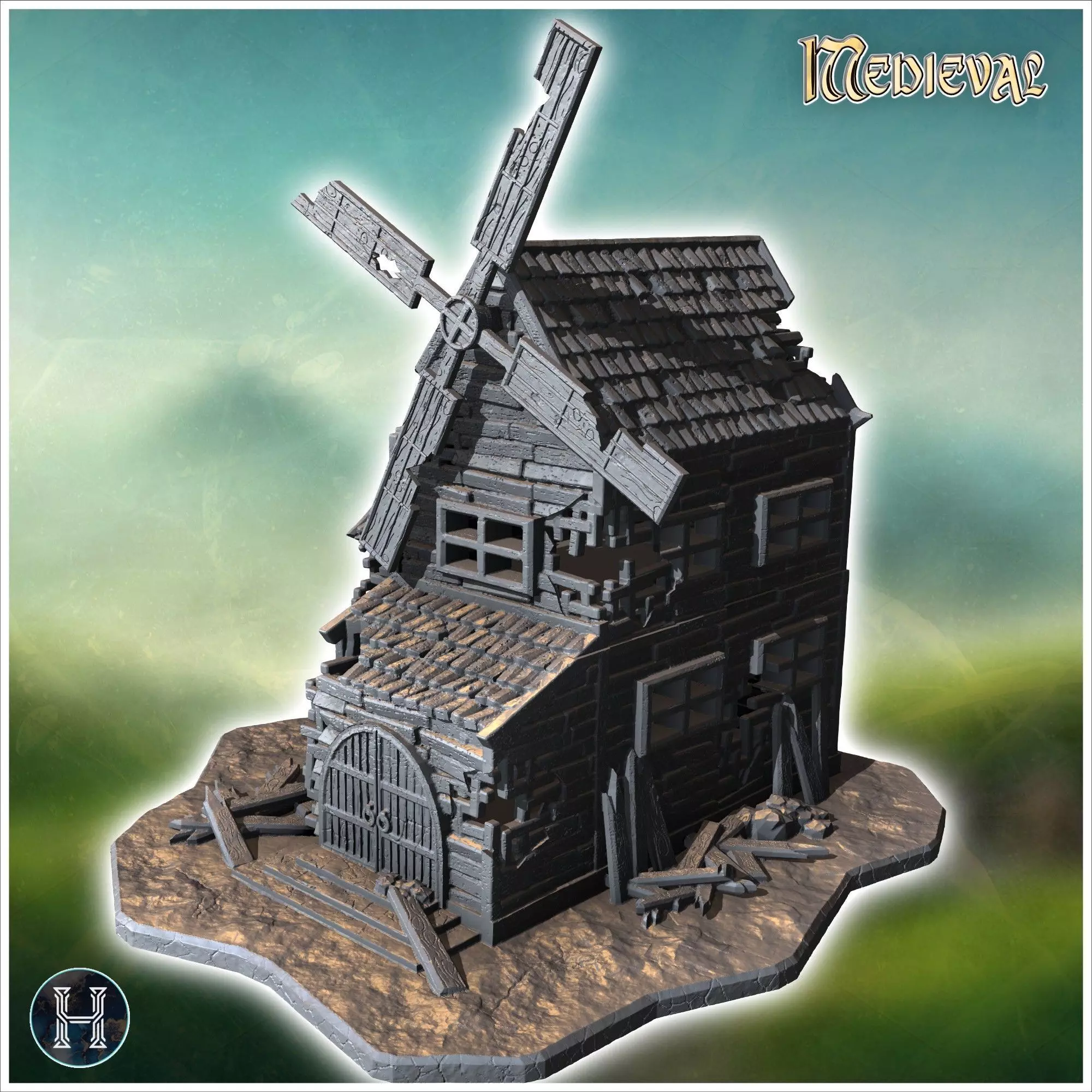 Old wooden windmill with broken blades damaged walls and scatter 3D print model
