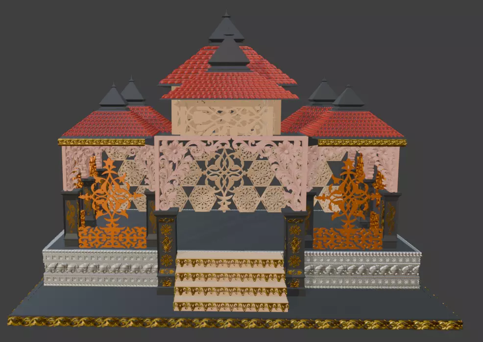 This highly detailed ornamental Indian temple pavilion (mandap) 3D model is designed for 3D printing, decoration, diorama, miniature architecture, and religious display projects. The model features intricate jaali patterns, layered temple roofs, carved pillars, decorative panels, and stepped platform details inspired by traditional Indian architecture.