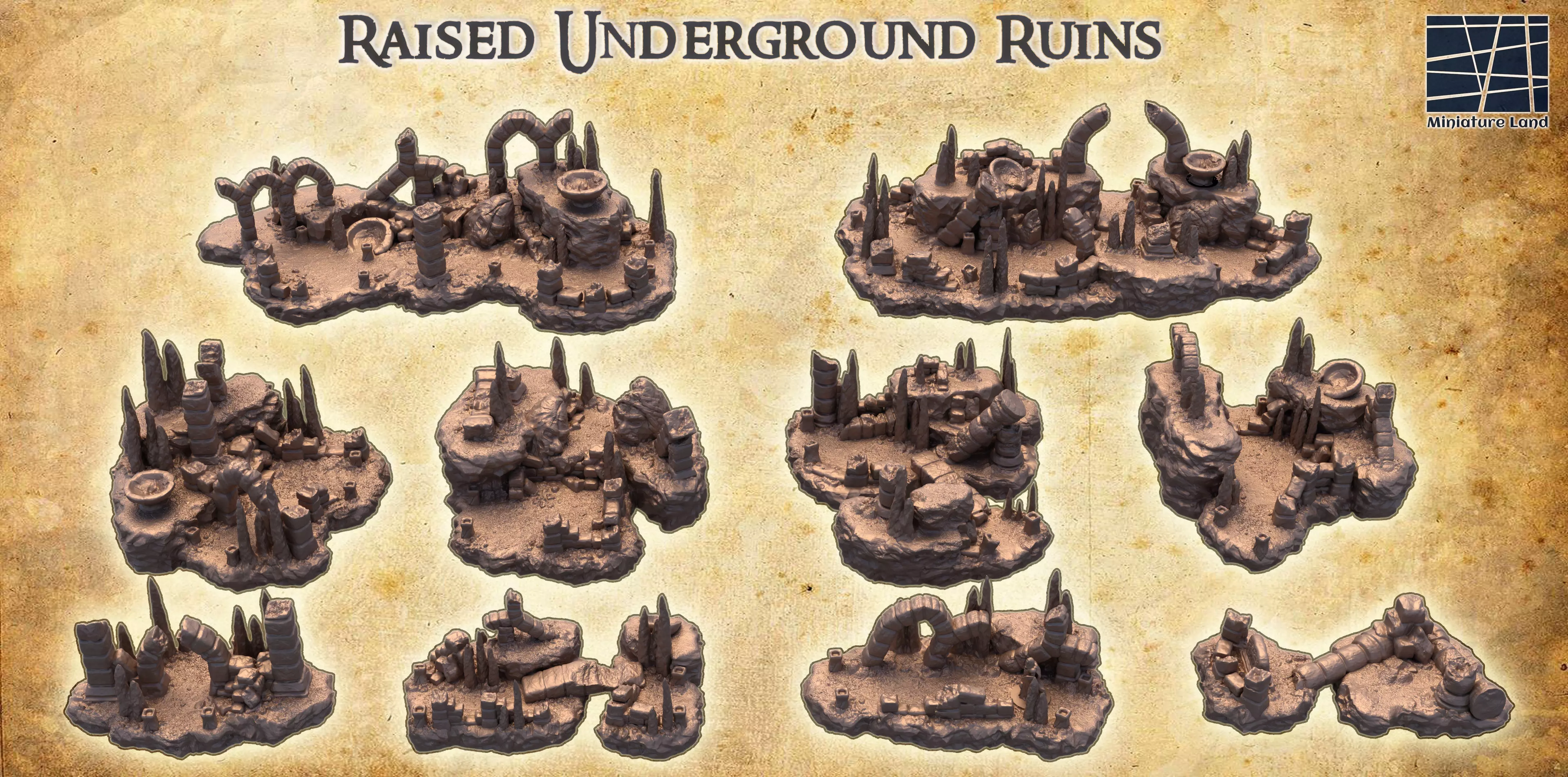 Series of modular underground ruins 10 different terrain4 small 4 medium 2 bigScaled for 28 mm miniatures