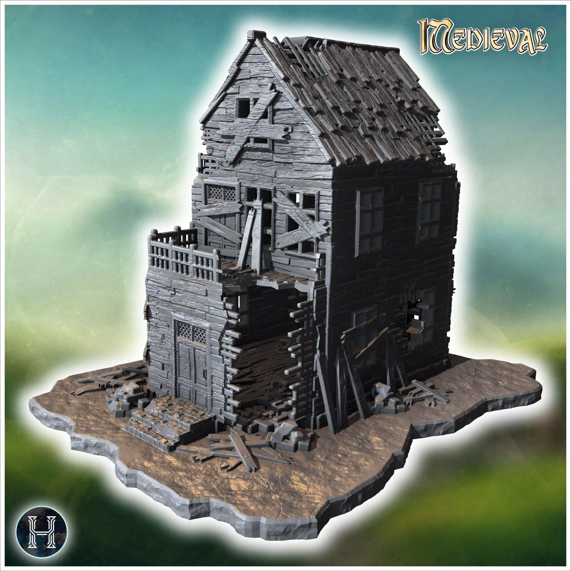 Ruined wooden building with a damaged upper floor broken porch a 3D print model
