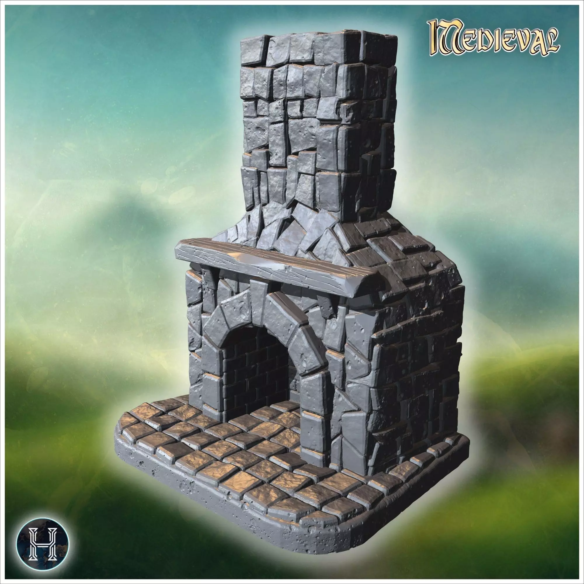 Rustic stone chimney with intricate brickwork and textured base 3D print model