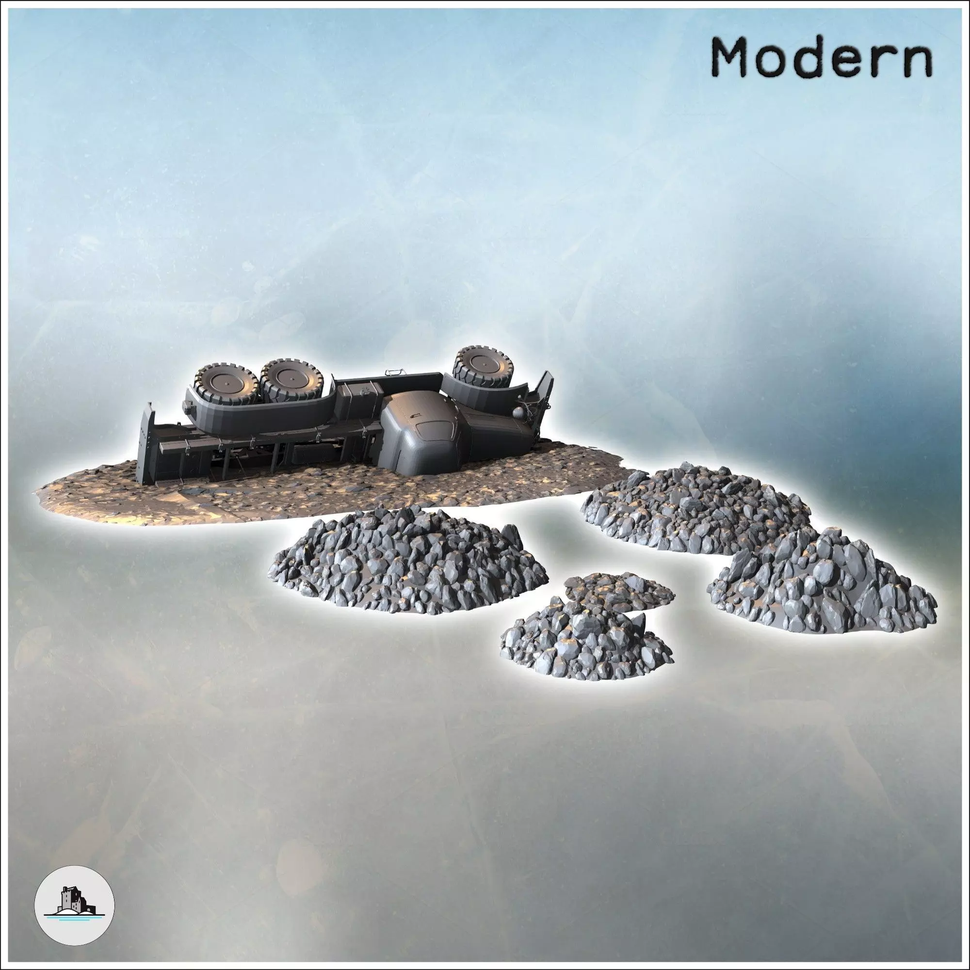Set of ruins and debris with the carcass of a six-wheeled truck 3D print model