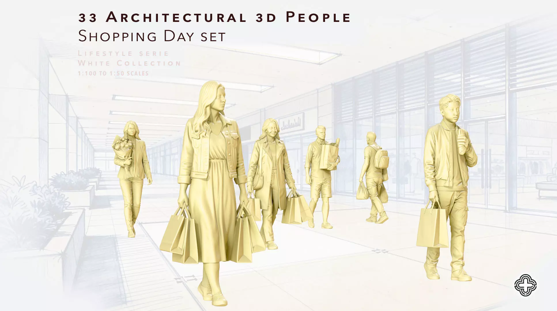 Shopping Day is a set of 33 architectural figures designed to bring life to commercial streets, public squares, and shopping malls. These figures, standing or walking, carry various shopping bags and packages, instantly creating a dynamic and busy retail atmosphere. The set features ordinary customers in neutral, contemporary outfits (casual to smart casual).