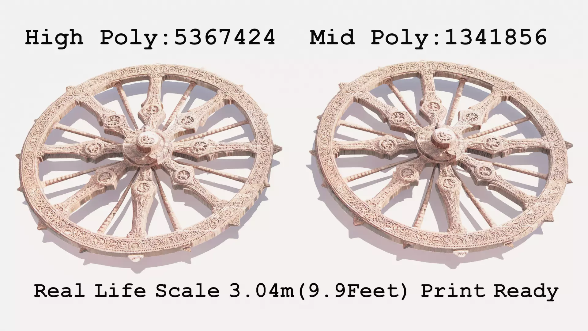 Polygon Count: 5,367,424Description: The high poly model is designed for maximum detail and realism. It includes intricate carvings, fine details, and high-resolution textures. This model is intended for rendering, close-up shots, or showcasing the wheel's fine craftsmanship.Mid Poly Model: