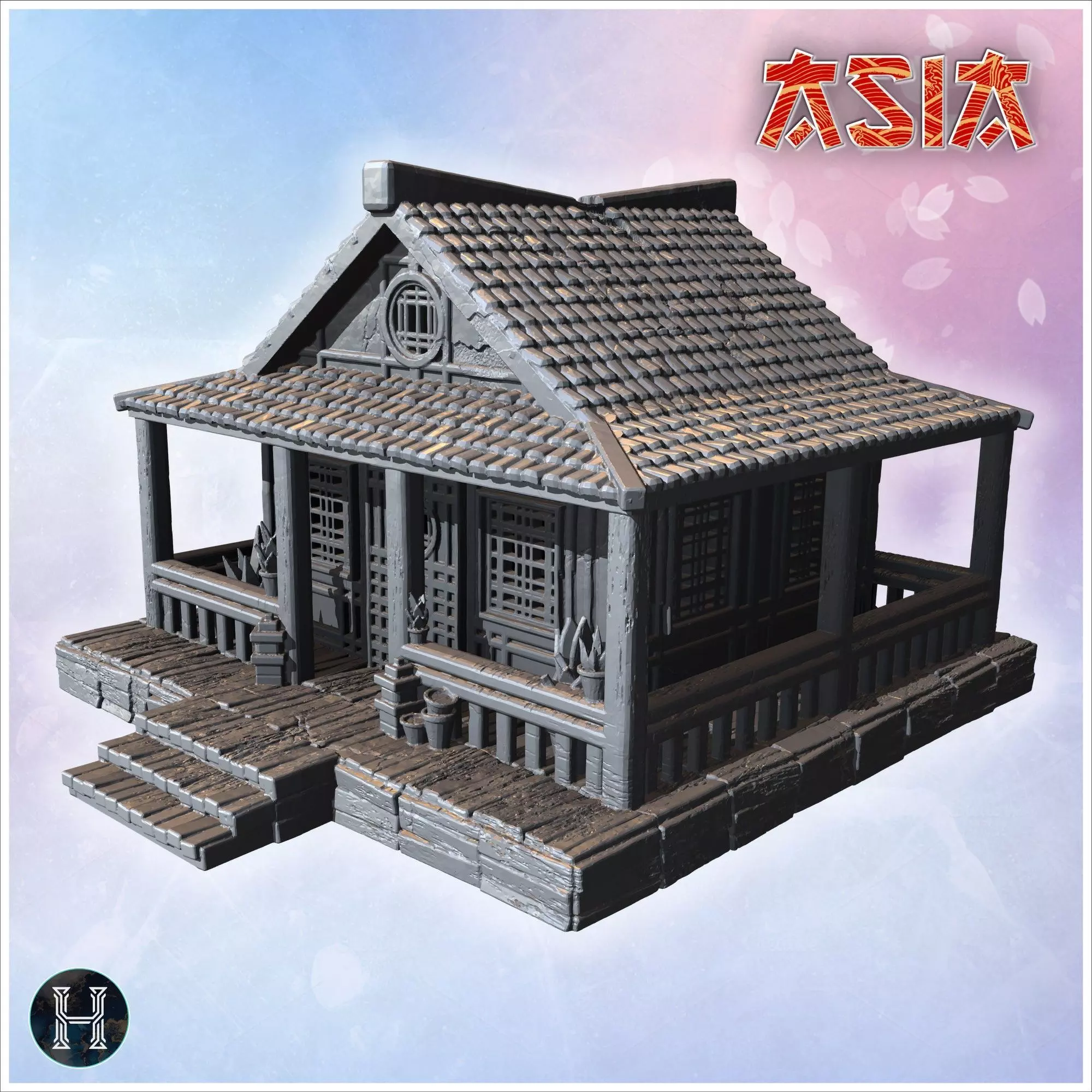 Single-story house with tiled roof wooden railings and decorativ 3D print model