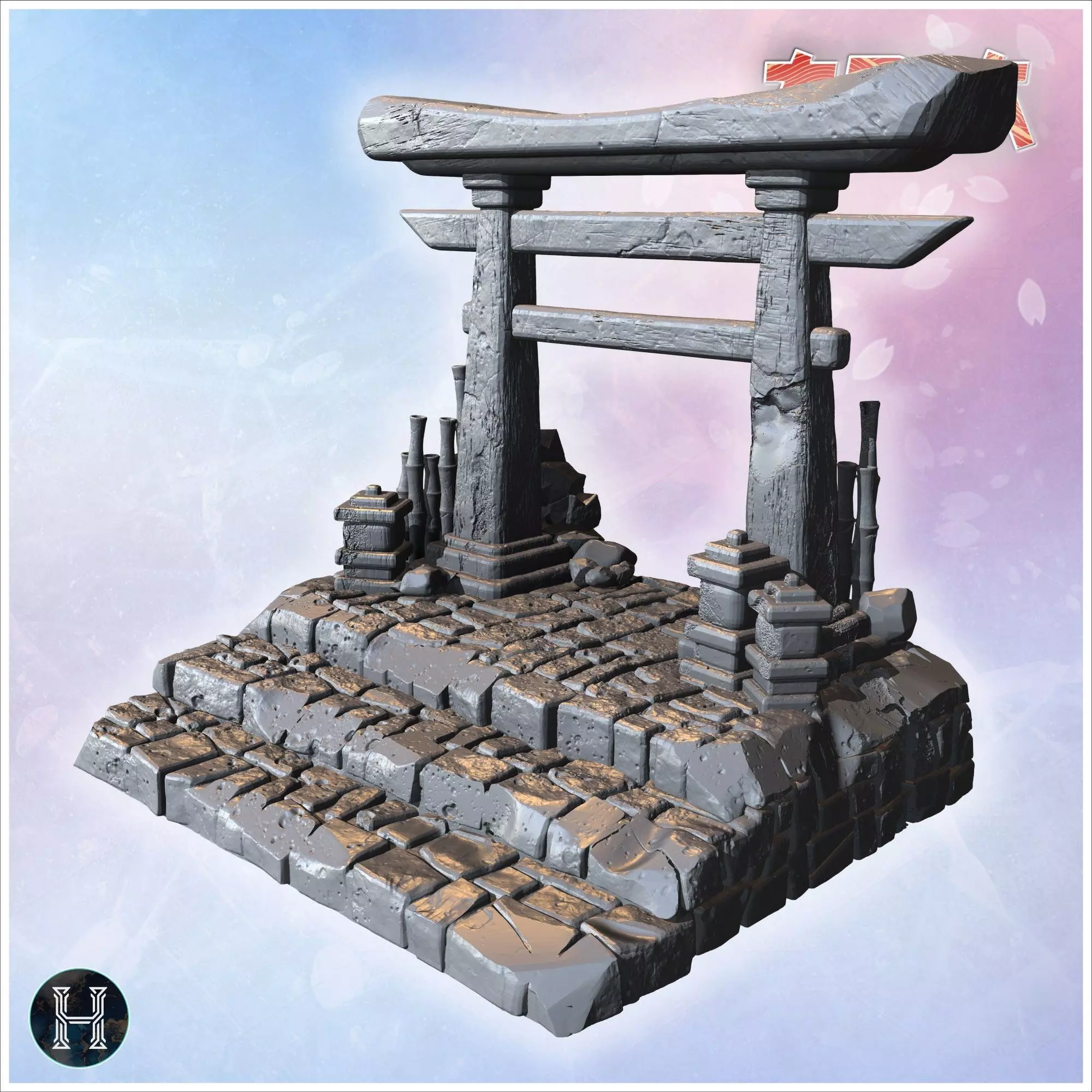 Small torii gate on stone steps with surrounding decorative bamb 3D print model