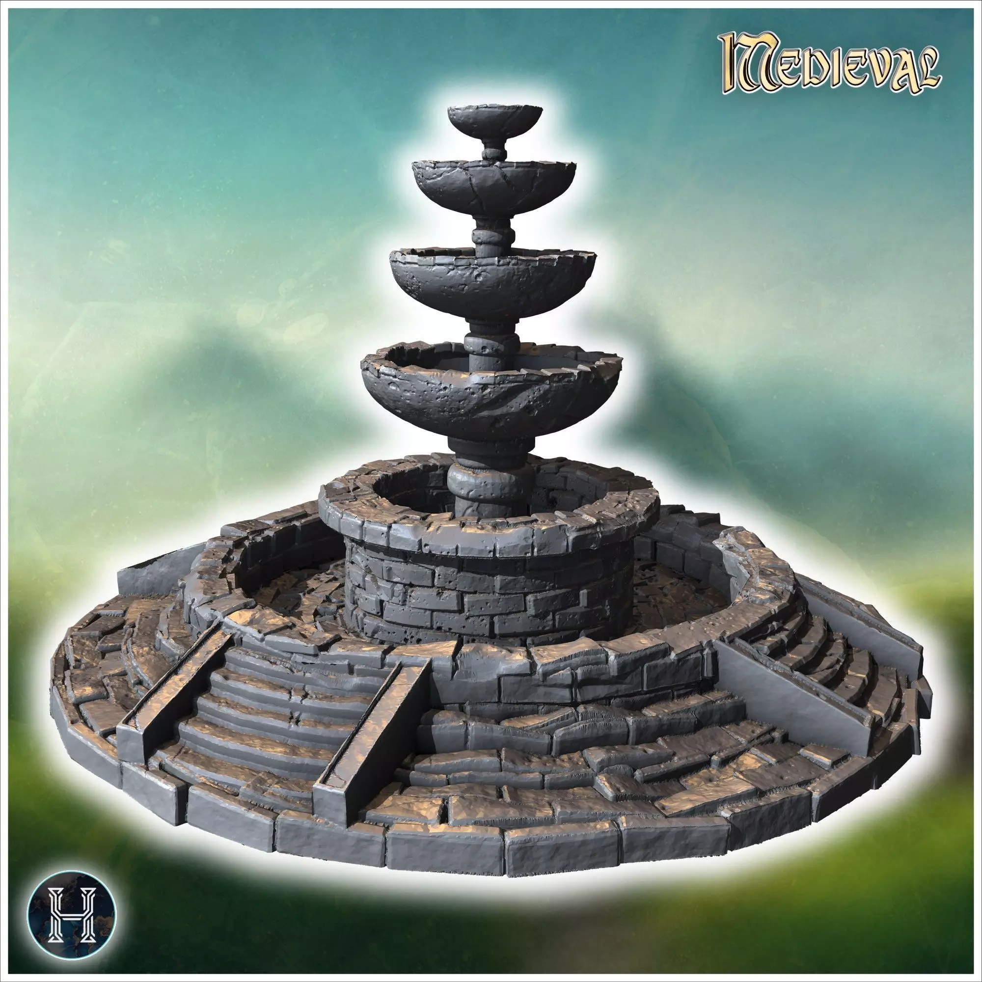Tiered stone fountain with multiple basins decorative steps and 3D print model
