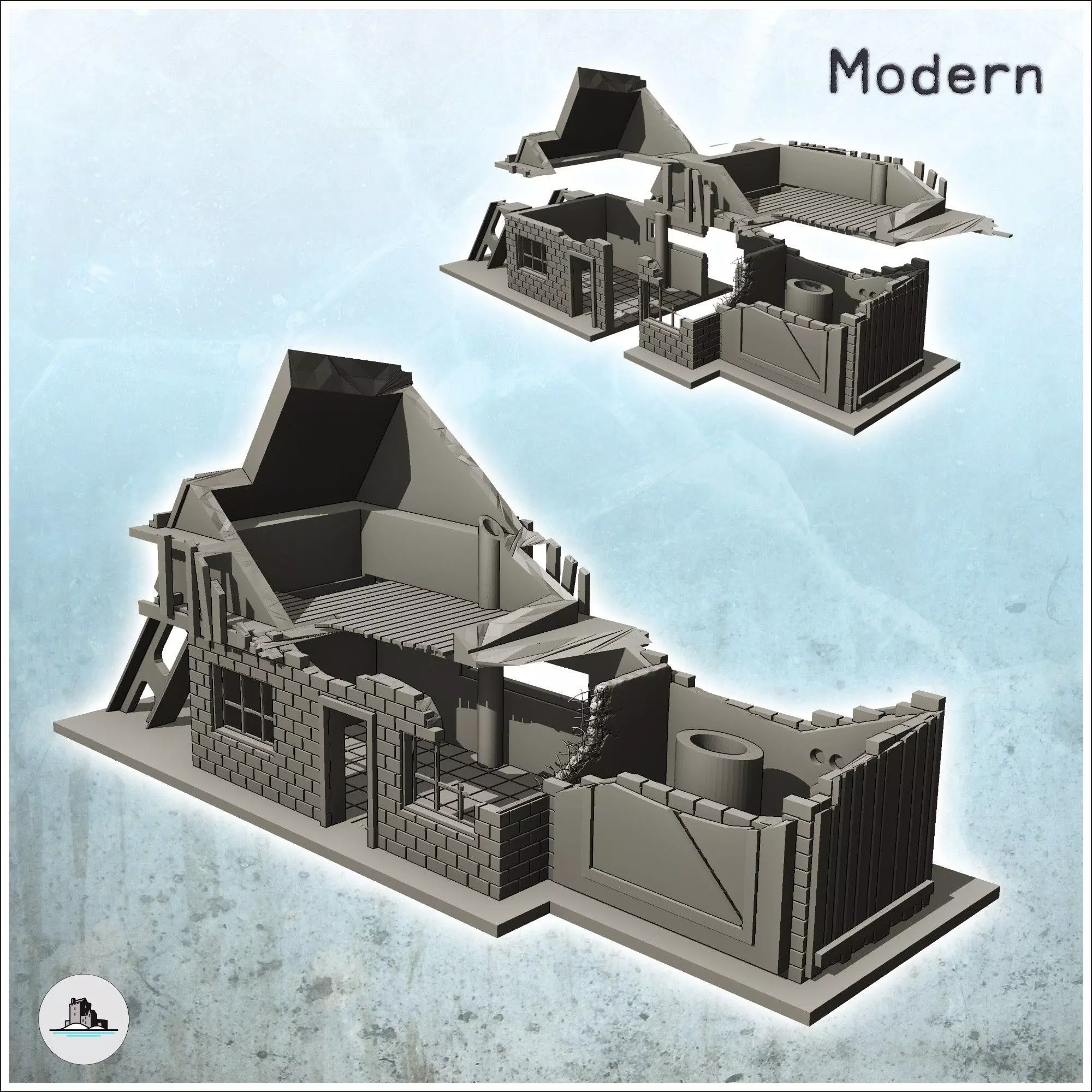 Two-storey brick factory with chimney and steel beam destroyed v 3D print model