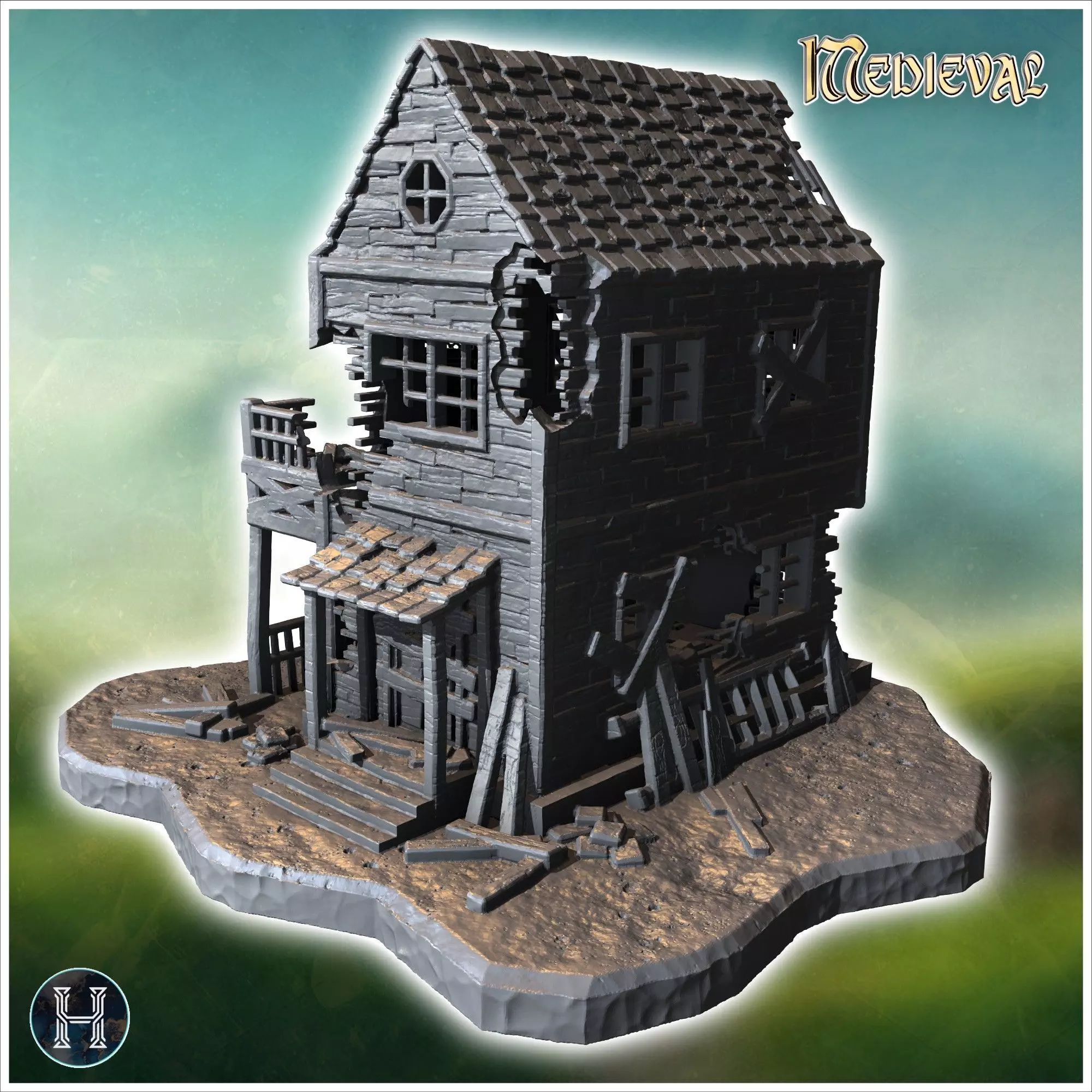 Two-story ruined house with damaged balcony shattered windows an 3D print model