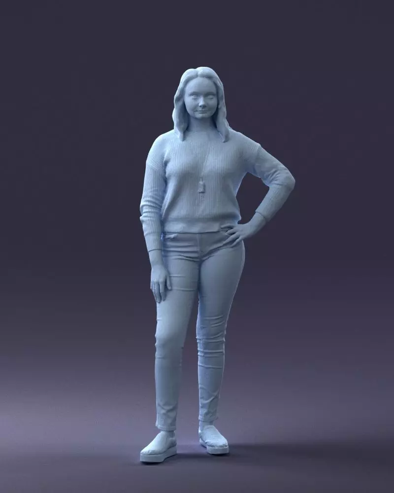 3D printable model of a woman standing in a casual outfit: light pink sweater, black pants, and white shoes. Captured with advanced 3D scanning technology, this model preserves realistic body proportions and clothing details. Optimized for 3D printing, it is ideal for collectibles, artistic displays, and dioramas.