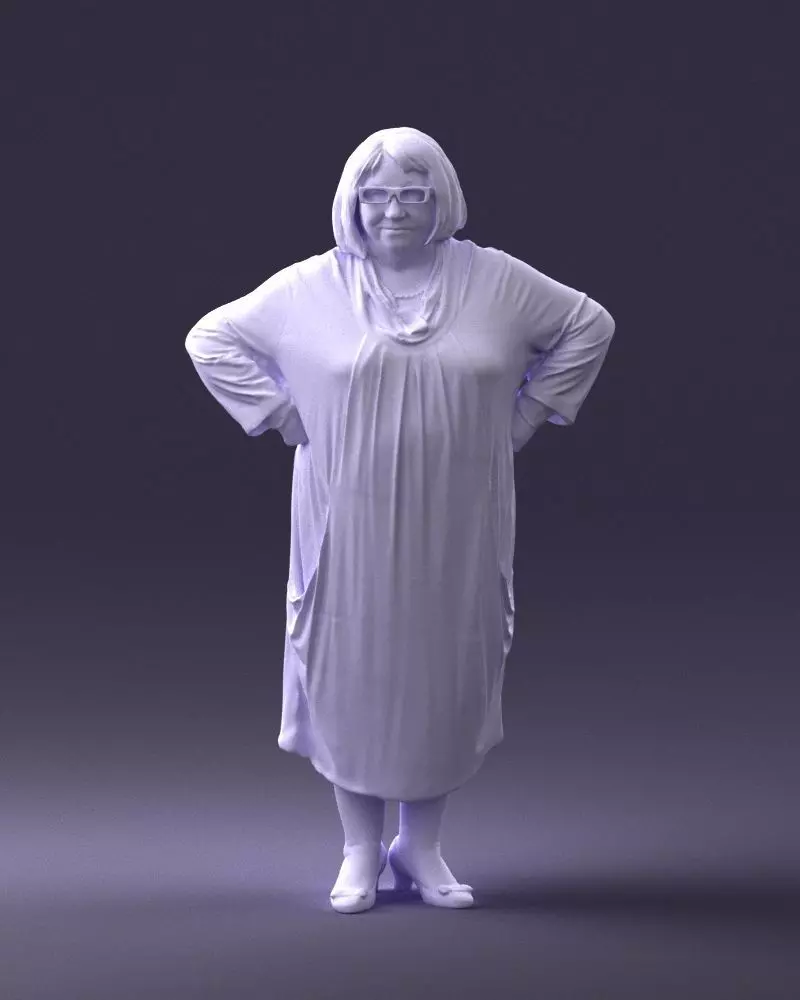 High-quality elderly woman figurine model, created using 3D scanning technology to capture natural proportions, confident stance, and authentic clothing folds. With glasses, hairstyle detail, and a recognizable pose, this model is perfect for miniature scenes and collectible character sets.