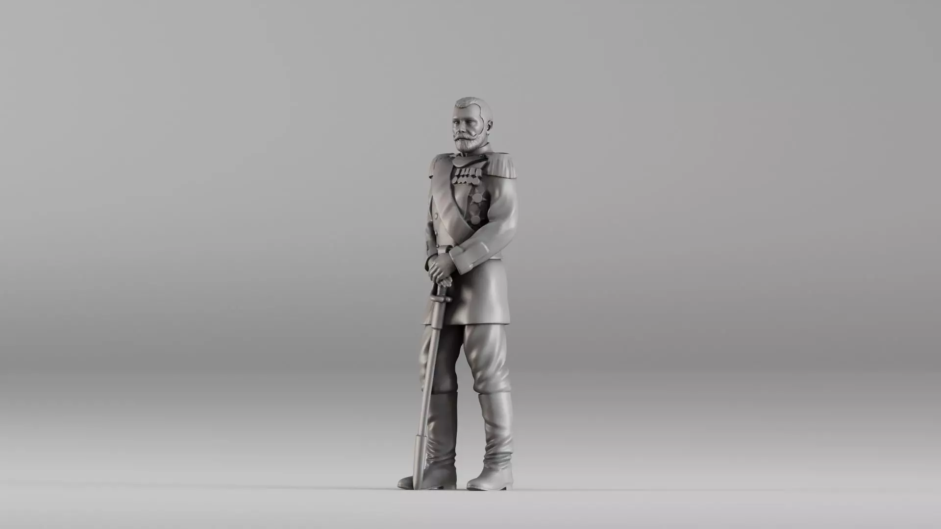 This is a high-resolution 3D model of Tsar Nicholas II, standing in full military uniform with a ceremonial sword. Designed for historical dioramas, collectible miniatures, or educational displays, the model captures lifelike posture and uniform detail—from the decorations and shoulder epaulets to the refined facial features and pose. Originally created using 3D scanning technology and refined for 3D printing, the model is hollowed and tested for watertight integrity, making it ideal for resin or FDM printing.