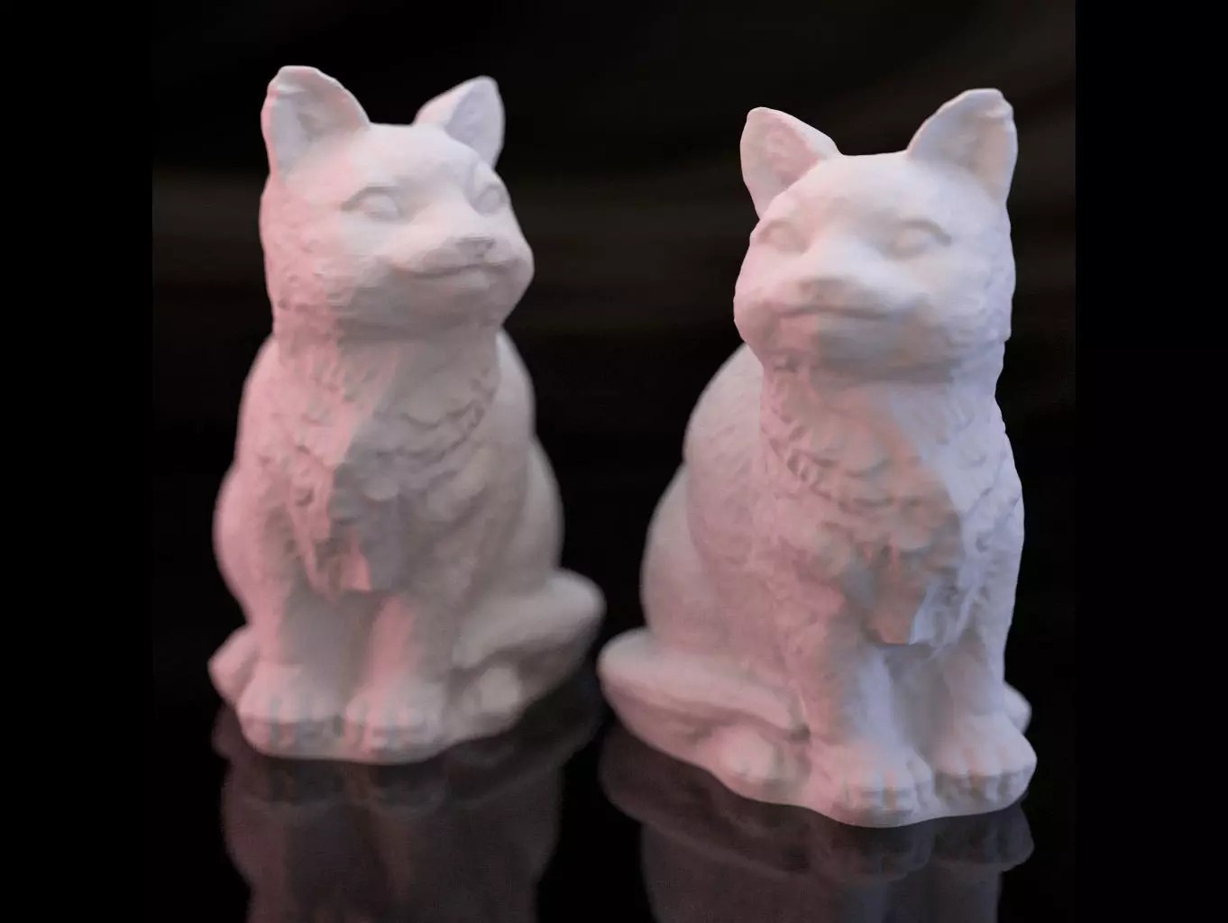Who doesn’t love kitties? And when it comes to kitties, two are always better than one. So you get two adorable kitties, mirror images. They 3d print just purrfectly, hollow without any support, in about 90 minutes each. These model prints so nice can’t even tell they are 3D printed. Paint to match your favorite pet.Also prints beautifully in cork screw mode using a single perimeter. Great for translucent or clear glass filament, yielding a delicate and beautiful piece of artwork.Print at 100% scale for small figurine or at 200% scale for a classic knick-knack.Prints without support. Here are 4 different print settings that work well with different results:5 perimeters – 0% infill: comes out totally hollow with a nice solid shell. Feels hollow.4 perimeters – 5% infill; has a heavier feeling to it.5 perimeters – 35% infill; has a solid feeling, yet prints in reasonable time without wasting material.1 perimeter, corkscrew vase mode – great for clear and translucent materials, or when you are in a real hurry. Please note, flat regions like at the top of the head and back, will not be 100% solid.