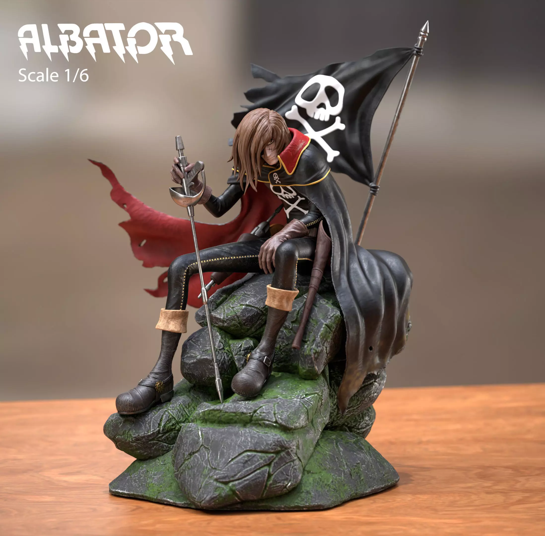 Bring the legendary Space Pirate to your collection with this premium 3D printable diorama of Captain Harlock (Albator). This model captures the iconic character in a moment of reflection, seated on a rocky outcrop with his tattered flag and gravity sabre.