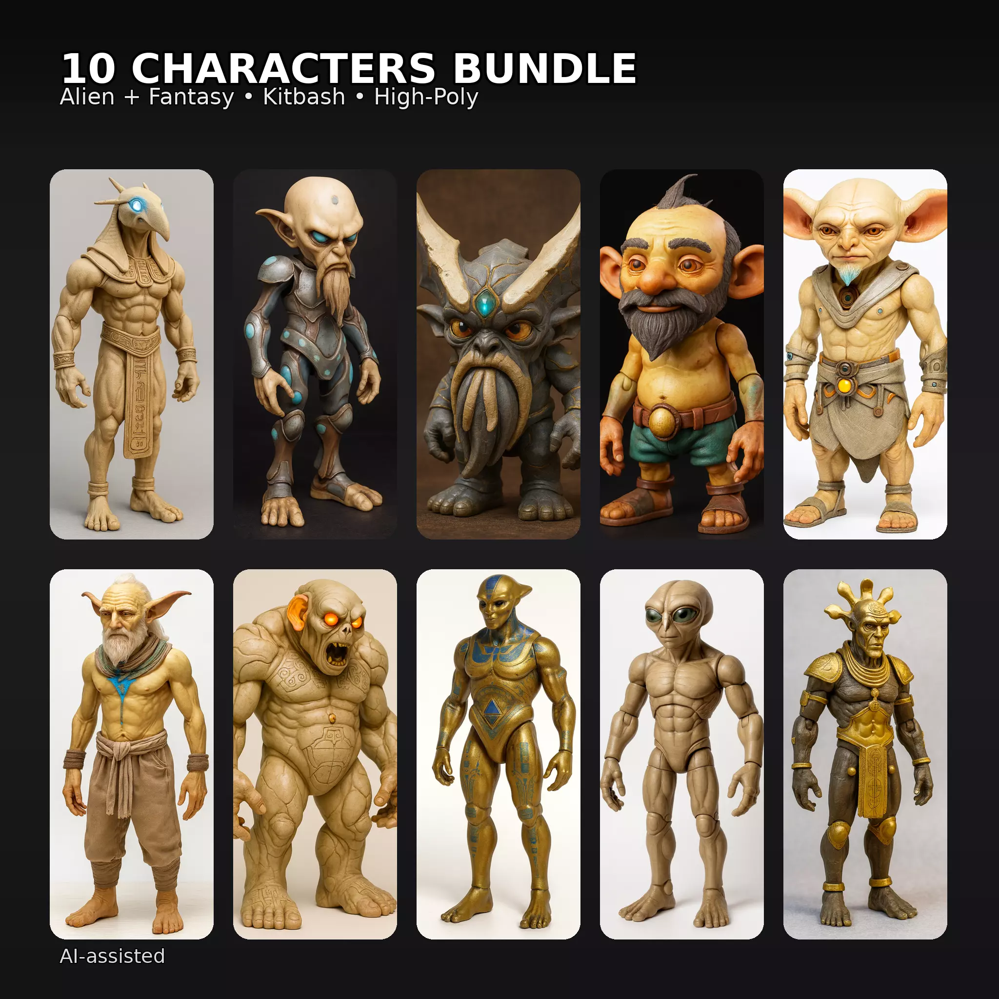 This bundle is a 10-character “Alien & Fantasy” kitbash pack—a curated mix of ancient-myth guardians, sci-fi beings, goblins, sages, and monsters. Each character is built with high-poly detail and strong silhouettes, so they look great for: