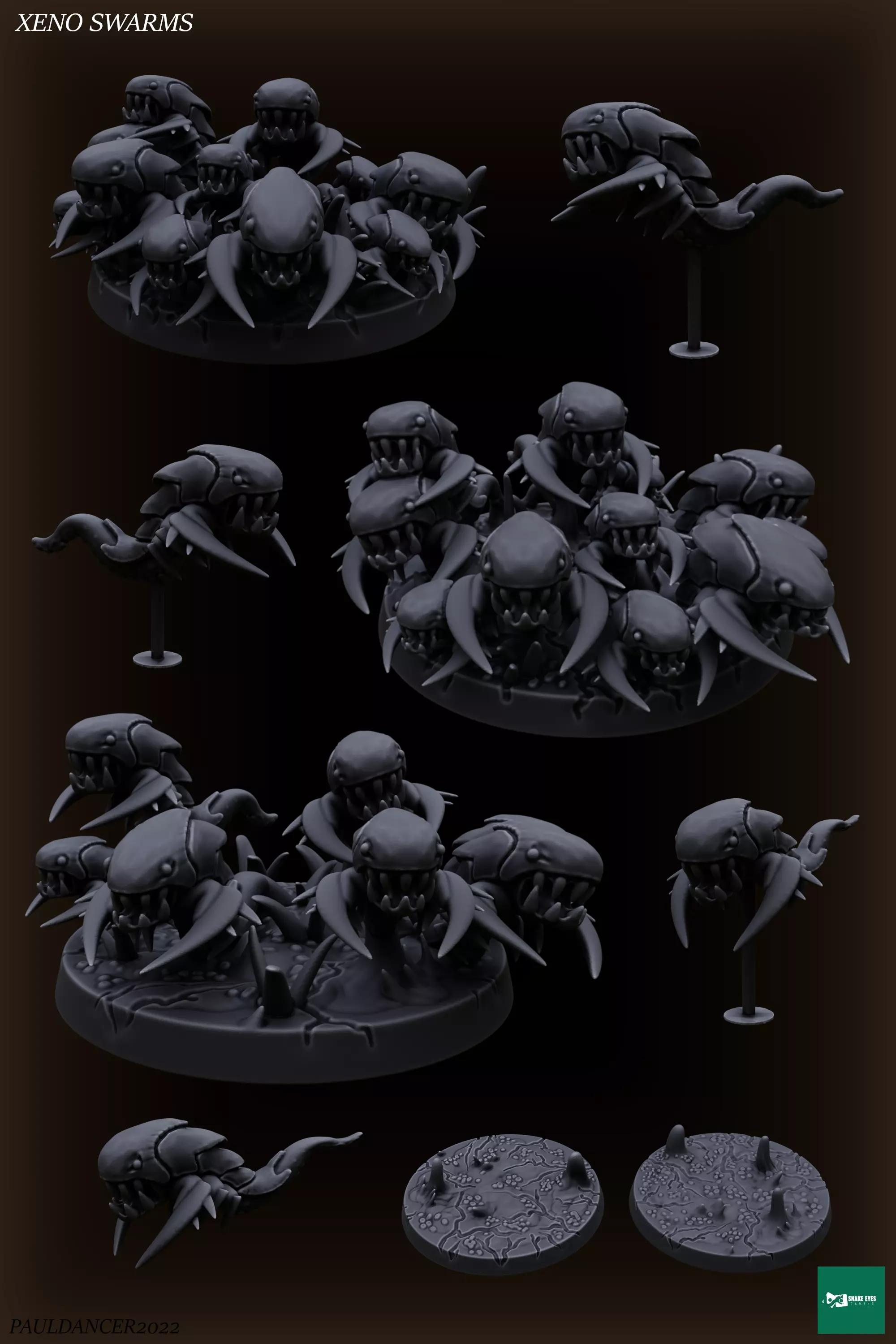 Includes:Based Swarms: Multi-creature bases (BASED-SWARM-A1, BASED-SWARM-A2, BASED-SWARM-A3) for group unit formationsSolo Creatures: Individual alien creatures in various poses (RIPPER-SOLO-A1, RIPPER-SOLO-A2, RIPPER-SOLO-A3)Raised Solo Creatures: Elevated models for added dynamism (RIPPER-SOLO-RAISED-A1, RIPPER-SOLO-RAISED-A2, RIPPER-SOLO-RAISED-A3)Bases: Unique alien-inspired bases (BASE-A1, BASE-A2)Design: These creatures are sculpted to convey a swarm-like movement and aggression, ideal for tabletop games that feature invading forces, infestations, or alien swarms.Support: Currently unsupportedThese models are optimized for easy printing while retaining intricate alien details, giving players a straightforward print-and-play experience. The Alien Xeno Swarm Creatures set is ready to bring fearsome style to any battlefield, adding excitement and intimidation to every encounter.