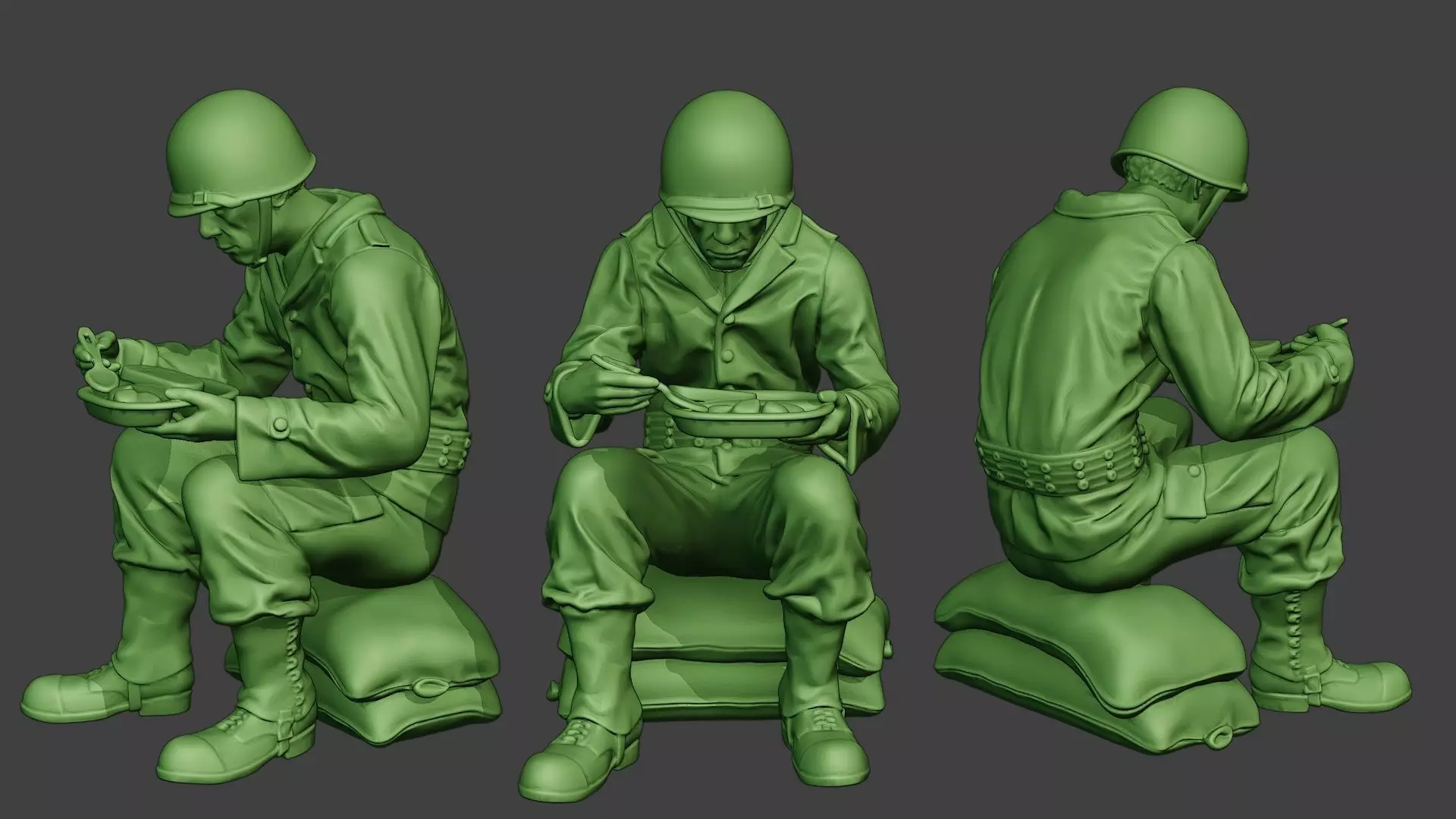 - American soldier model with guns, clothes and more. Model Eating on sandbags.