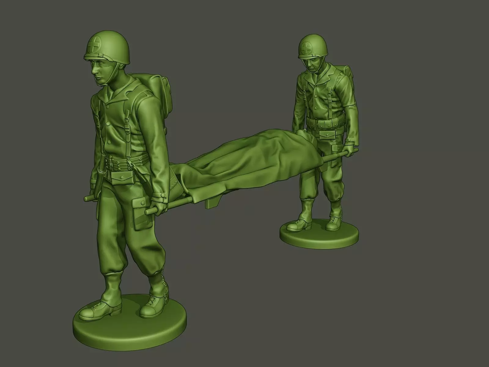 1 Mesh Model (Object and Base merged, several files) and the same mesh without Base.3 Meshes divided. (two models carring a stretcher and wounded soldier) and the same meshes without Bases.High resolution