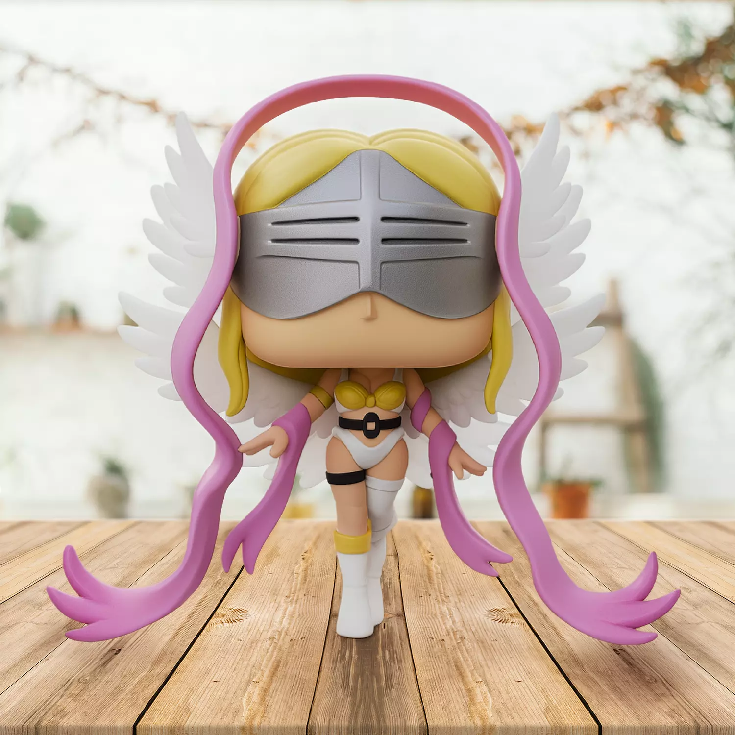 Funko Pop–style figure inspired by Angewomon, one of the most iconic Digimon in the series.The design preserves the signature Funko aesthetic: a large head, small simplified body, glossy black eyes, and chibi proportions.