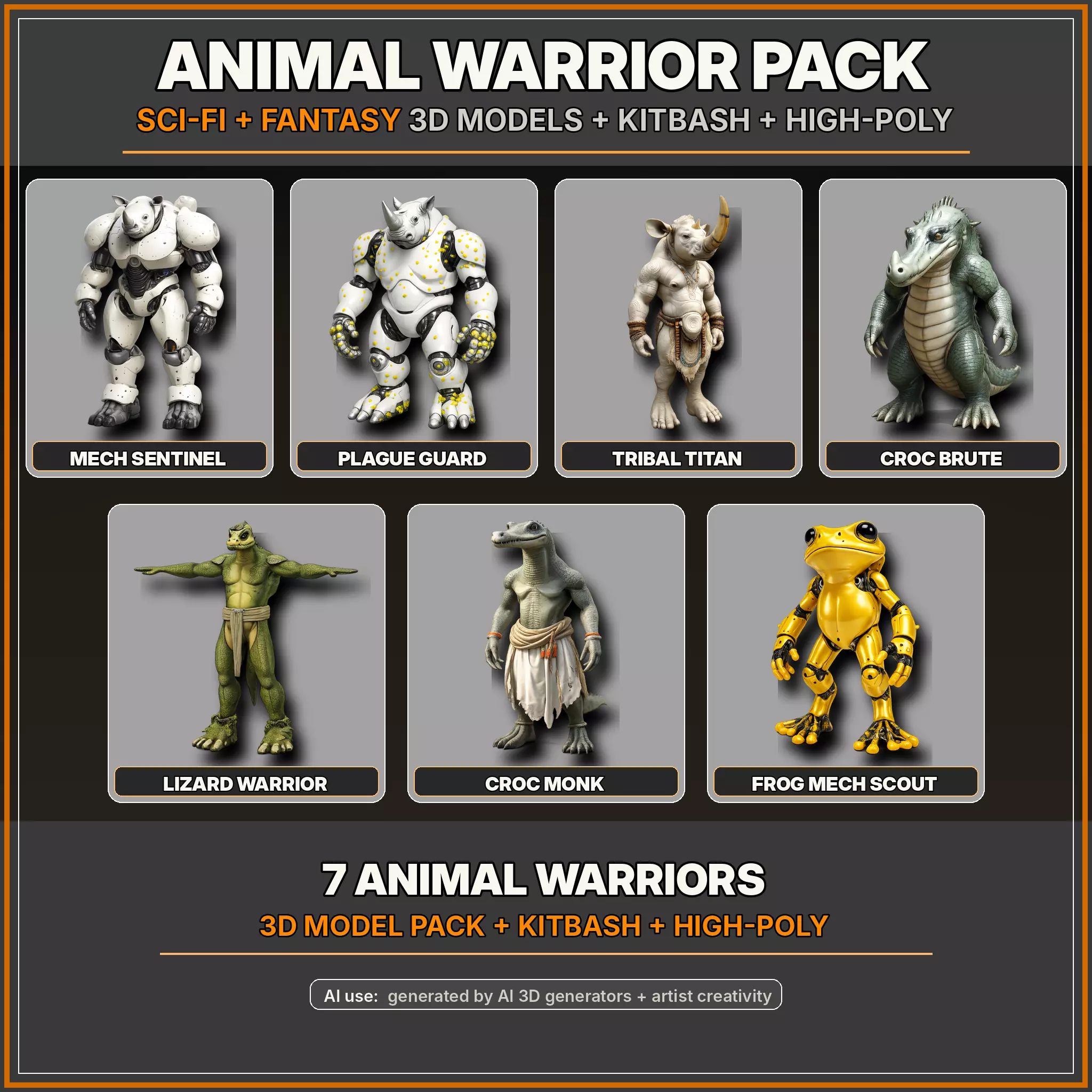 3D Design ConceptThis Animal Warrior Pack features a collection of high-poly anthropomorphic animal characters designed with a mix of sci-fi armor, fantasy warrior style, creature design, and kitbash detailing. The pack includes powerful rhino warriors, crocodile/lizard-style fantasy fighters, and a bright frog mech scout.Each character is designed with strong silhouettes, detailed anatomy, armor panels, creature textures, and stylized proportions, making them suitable for fantasy worlds, sci-fi games, cinematic scenes, collectibles, animation projects, and 3D printing display pieces.The visual style combines high-poly creature sculpture, robotic/mechanical elements, and fantasy tribal details to create a unique customer-ready 3D asset pack.