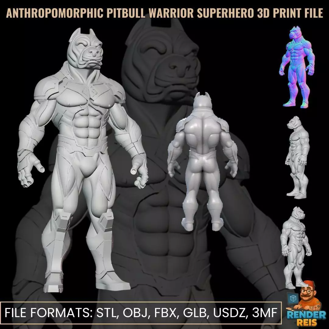 This 3D model represents a powerful and muscular pitbull warrior in a superhero or sci-fi style. The character features exaggerated human-like musculature, detailed armor plating, and a determined facial expression. With the distinctive head structure of a pitbull, cropped/upright ears, and a fierce look, the design emphasizes strength and dominance. The futuristic armor plates on the shoulders, chest, arms, and legs reinforce its identity as both a modern superhero and a warrior. Perfect for collectors, tabletop displays, or painting enthusiasts.