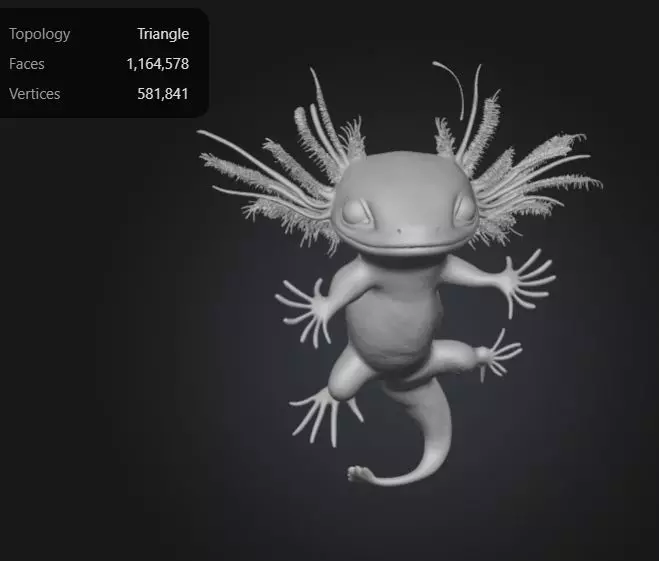 Axolotl – High-Poly 3D Model (Grayscale Sculpt)This intricately sculpted axolotl model captures the delicate anatomy and iconic features of the aquatic salamander, rendered in grayscale for maximum detail clarity. Designed using Meshy AI’s full suite of tools, it includes:• Topology: Triangle mesh• Faces: 1,164,578 • Vertices: 581,841• Rigging: Not rigged• UVs: Fully unwrapped and ready for custom texturing• Style: Anatomically expressive with stylized gill fronds and dynamic floating pose• Textures: Grayscale base sculpt—ideal for baking, painting, or shader experimentation• Use Cases: Perfect for animation, scientific visualization, stylized games, or fantasy creature design• Format: [Specify file format—e.g., .obj, .fbx, .glb]• Compatibility: Compatible with Blender, Maya, ZBrush, Unreal Engine, Unity, and other major platformsThis model offers a clean, high-resolution base for artists and developers looking to customize or animate a unique amphibious character. Whether you're building a magical underwater world or a stylized biology sim, this axolotl is ready to evolve.
