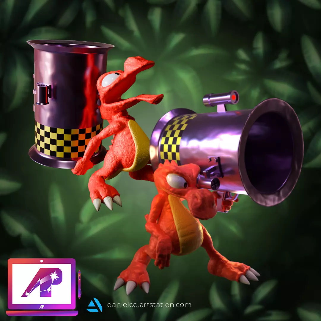 They wield large barrel cannons with laser sighters, and bear a passing resemblance to Kopters. They are the game's equivalent of Kannons, shooting barrels in a pattern, or crazily in one direction. They can shoot all kinds of barrels, including TNT Barrels or Steel Kegs, and bouncing on their projectiles is often mandatory to cross gaps or to reach Bonus Areas. In several stages, a Bazuka is needed to reach that stage's DK Coin: Dixie and Kiddy must lure him into shooting a Steel Keg at a Koin. Bazukas can't hurt the Kongs directly, but their barrel cannons protect them from Dixie and Kiddy's direct attacks. However, it's possible to defeat a Bazuka just by throwing a TNT Barrel at one.